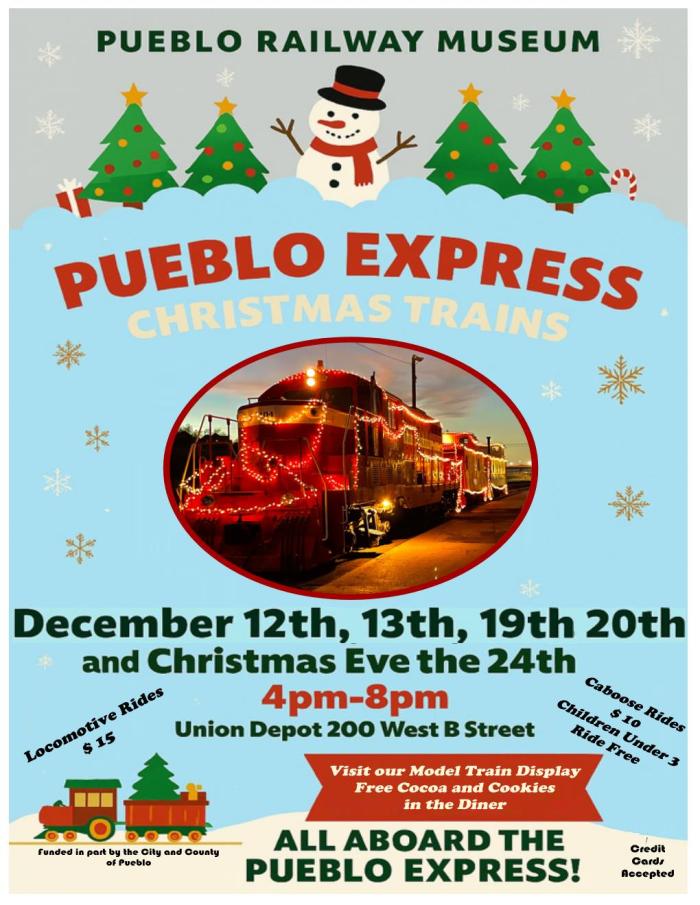 Join the Pueblo Railway Museum for our “Pueblo Express” public Christmas Train Ride event on Friday and Saturday, December 12 and 13, Friday and Saturday, December 19 and 20, and Wednesday December 24. Train rides will be available from 4PM to 8PM behind the Pueblo Union Depot. Train ride tickets are $15 for a ride in the engine, and $10 for a ride in one of our three cabooses. Children under 3 ride the train free! Cash or check preferred, but credit cards accepted. Train ride tickets can only be purchased during the event. Purchase your tickets at our Gift Shop, a converted caboose behind the Depot, near the passenger boarding area. Trains depart every 20 minutes, so there will be multiple opportunities during the event to ride the train.