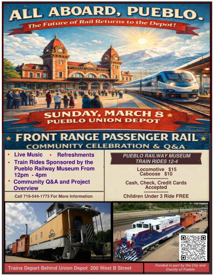 Join the Pueblo Railway Museum for Train Rides at the Depot on Sunday, March 8, and find out what’s new with Front Range Passenger Rail. FRPR will present an update in the Pueblo Union Depot from 1PM to 2:30PM. Train rides will be available from 12PM to 4PM behind the Depot. Train ride tickets are $15 for a ride in the engine, and $10 for a ride in one of our three cabooses. Children under 3 ride the train free! Cash or check preferred, but credit cards accepted. Train ride tickets can only be purchased during the event. Purchase your tickets at our Gift Shop, a converted caboose behind the Depot, near the passenger boarding area. Trains depart every 20 minutes, so there will be multiple opportunities during the event to ride the train.