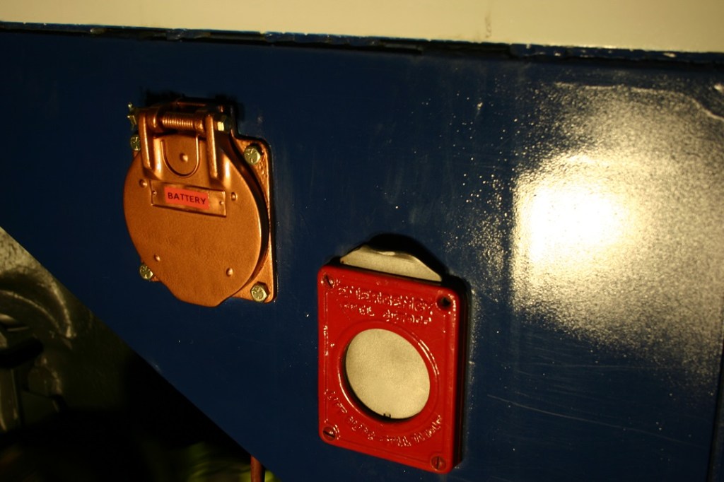 This effort today finishes a larger project on all three of our GP-7 locomotives that allows us to charge the unit batteries with a simple ground level hook up. Our new battery charger can handle the load to keep our batteries healthy.