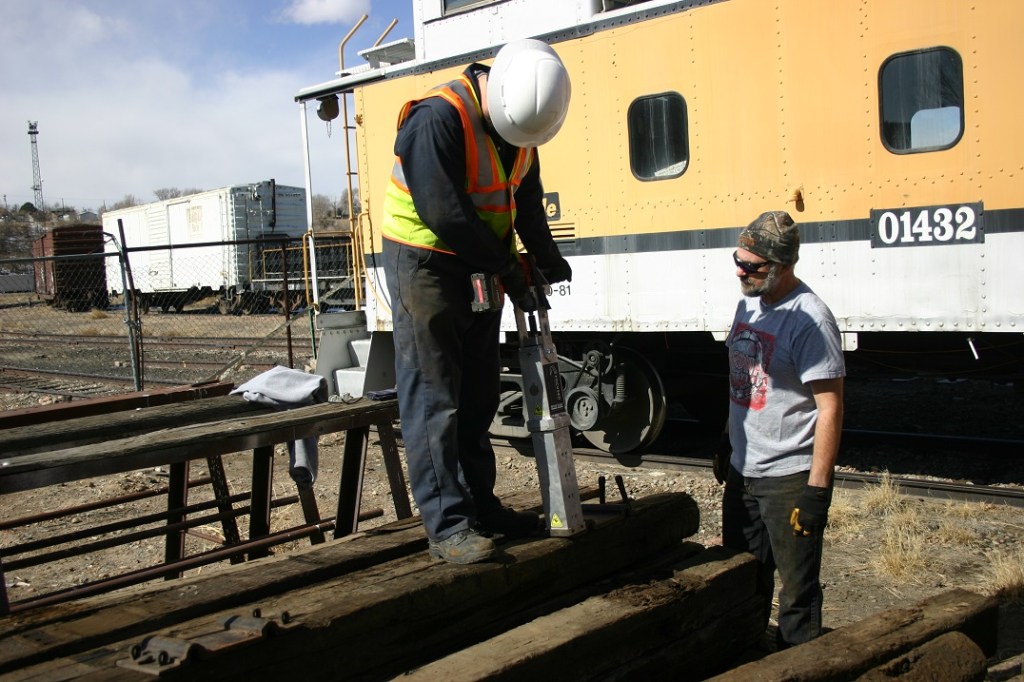 On Saturday 2/27, Dwight Maxey, David Hunter, Kendall Crouch, Colin Mellin and Paul Brown got busy at the Museum. We worked on a variety of tasks with David and Kendall taking on the biggest task of pulling spikes and tie plates from ties to get them ready for reuse. They used our new spike puller which sure makes things easy on the back! While some of the work still required the good old pry bar the impact driver powered tool speeds up the work considerably! Colin spent a good part of the morning cutting old pallets apart to fit them in the trash. Paul and Dwight did a start up of Engine #104 to make sure the cold snap didn’t cause any problems as this engine will be getting used later the Spring. We also found that Engine #103 lost one of it’s batteries due to the extremely cold temperatures. It now has a cell that cracked and will not hold electrolyte. So now we have to determine if just one battery needs replaced or the entire set.