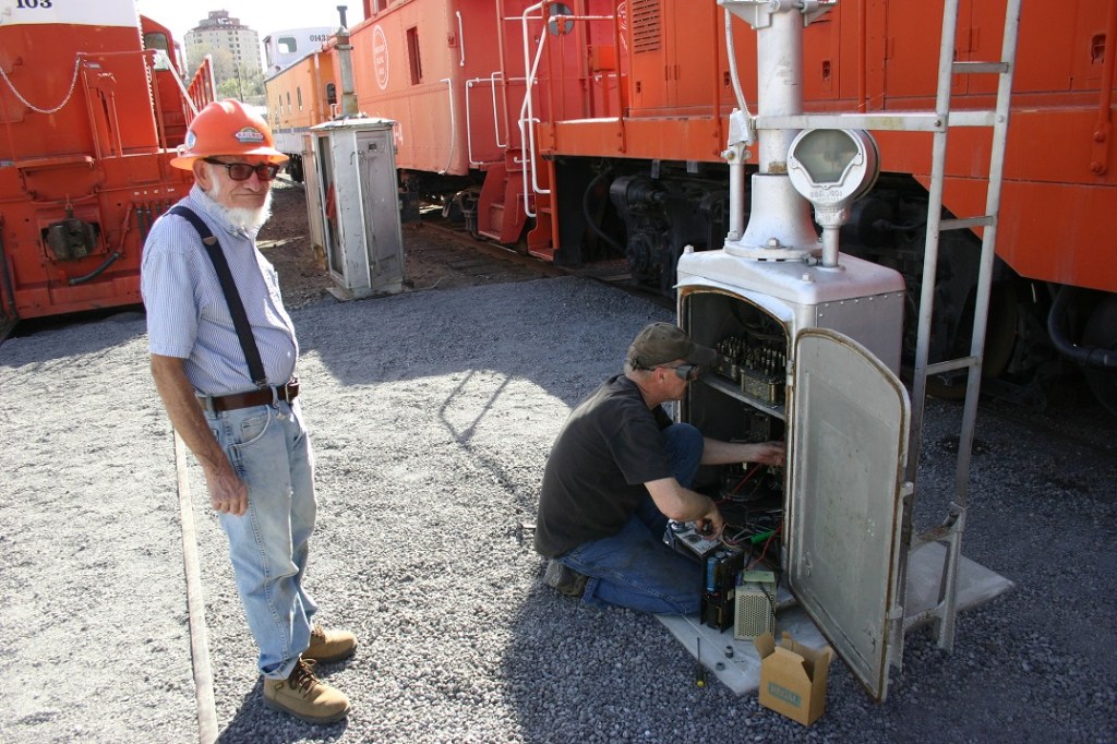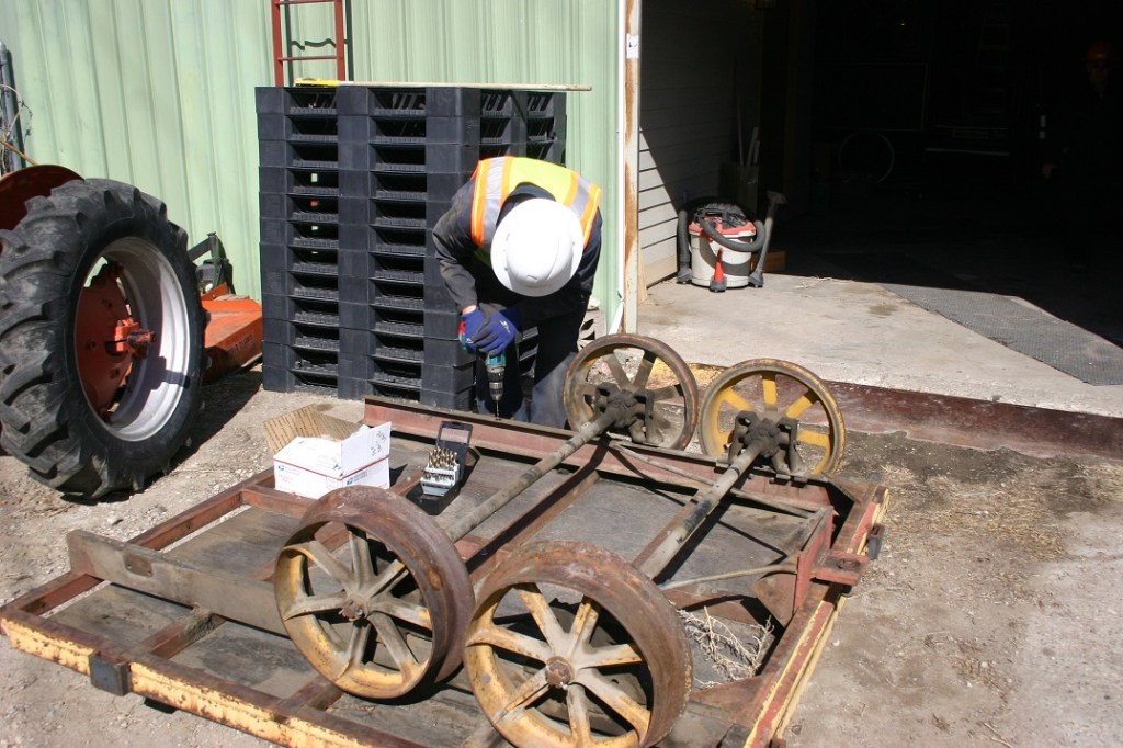 On Saturday, April 24, we had a few people show up for some fun. Colin Mellin, David Hunter, Dwight Maxey, Geoff Barker and Paul Brown were busy with the variety of tasks scheduled. Dave kept up the progress on a small project to shorten the wheel base on one of our small rail carts. He was able to drill new mounting holes for one of the axles. Paul and Colin made a morning of the tumble weed clean up. With only the two of them they burned up three hours just clearing out blown in trees, I mean tumble weeds. With the size of some of these, you would think ponderosa pines had blown down off the mountains!! Dwight stayed busy in the shop yard. After lunch, Geoff joined the crew to work on wiring the signals that were installed a couple weeks back. A few hours work and we had them working! Now we just need to fine tune the operation of the semaphore and get the bell awakened on the wig wag.