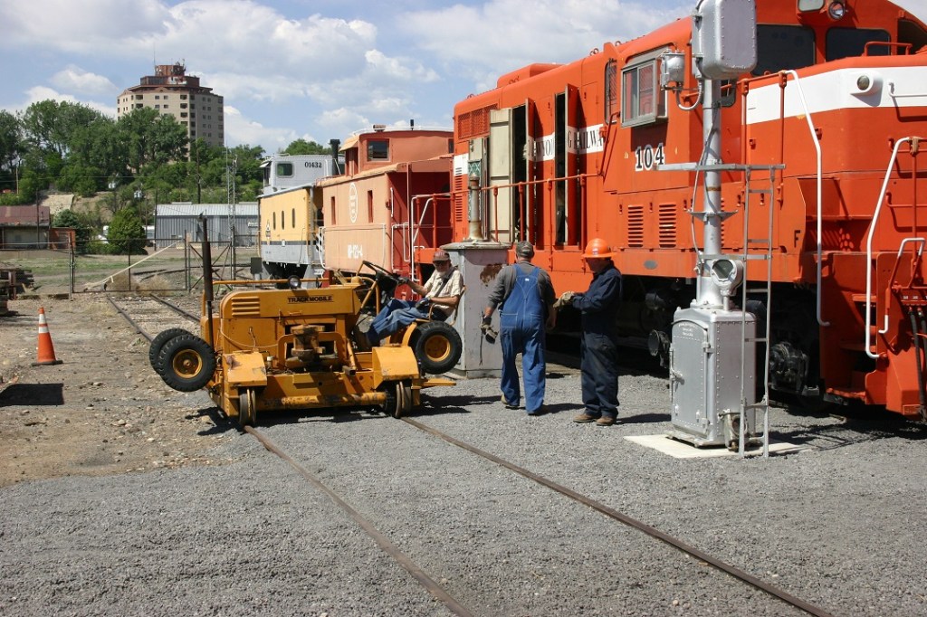 On Saturday, May 29, we had a small crew come out to take care of the equipment moves at the Museum. Dwight Maxey, Colin Mellin, Dan Reichenbach and Paul Brown got busy getting the track speeders and Trackmobile equipment disassembled and stored in different corners of the shop area to get ready for the Summer event season. After finishing this work, Engine 104 was fired up and used to switch the AT&SF Waycar to an area just outside the shop door, so that work can start to get this car in shape. This move required grabbing a string of six cars and making one long move.