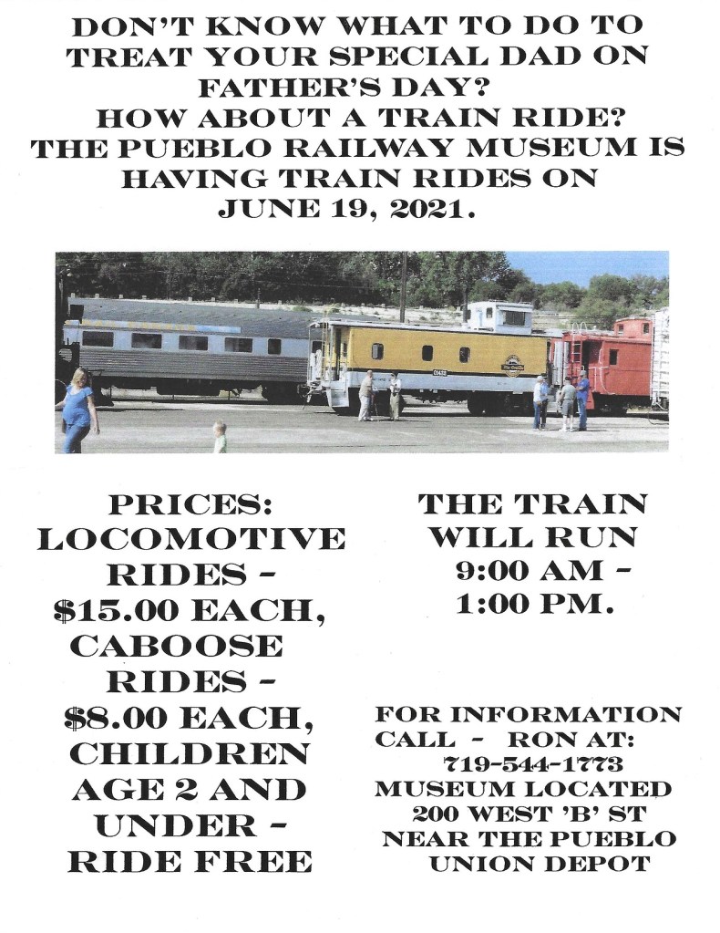 Join us on Saturday, June 19 at the Pueblo Union Depot, as the Pueblo Railway Museum hosts its special Father’s Day Train! This event will take place from 9AM to 1PM. Face masks are no longer required for those who are vaccinated. We will be running our red, white and blue Patriot engine for this event, along with two cabooses. Train ride tickets are $8 for a caboose ride, and $15 for a ride in the locomotive, with children under two free. Cash or check only, please.