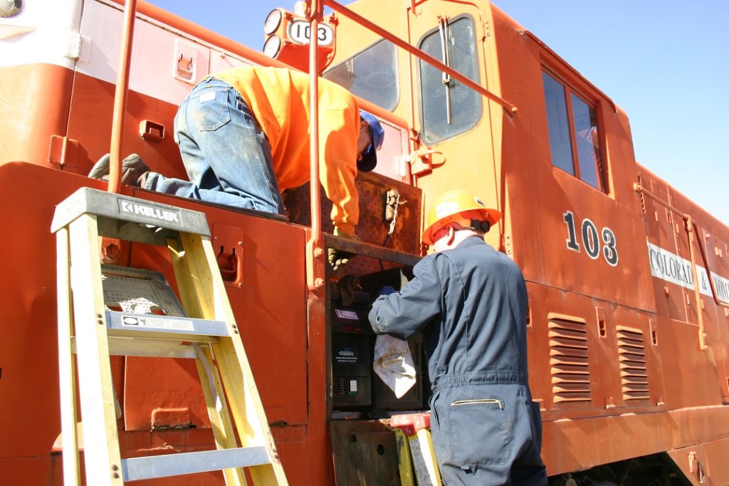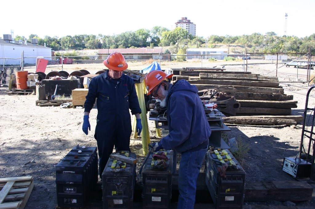 On Saturday, October 16, we had a good group of volunteers assemble to get some batteries installed into Engine 103. Dwight Maxey, Dan Reichenbach, Colin Mellin, Tyler Seeley and Paul Brown all did their part to help get our new battery un-crated, as well as get another battery from inside the shop moved out next to the locomotive to install. After Dwight and Colin checked the liquid levels of each battery, we slowly started to lift each one into the battery compartment. Each battery was carefully handled so as not to spill acid, or to make contact with the steel surrounding the compartment. Later in the afternoon, we made the final cable connections, and then plugged in our battery charger to get the batteries up to full charge.