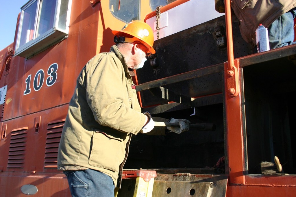 On Saturday, January 15, nice weather returned to the Pueblo area, so a small group of volunteers came out to work on Engine 103 and our two cabooses. Dwight Maxey, Colin Mellin, Tyler Seeley, Tanner Seeley and Paul Brown stayed busy removing some wiring from under the cabooses and planning a rack to put our generator on when it is needed for train lighting. We hope this will make the generator less noticeable during our events, and easier for the crew to set up when needed. We also did more work on Engine 103 to prepare the battery box for reinstalling the batteries. We removed part of an angle iron brace to give us more clearance for the cables. Next we will do work to repair the floor area of the compartment.