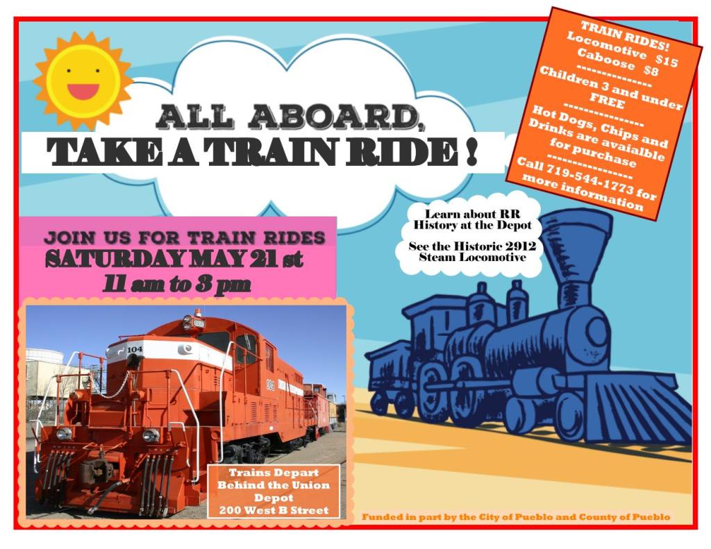 Join us on Saturday, May 21, at the Pueblo Union Depot, for the second event of the Pueblo Railway Museum’s 2022 train ride season! This event will take place from 11AM to 3PM, and marks the debut of a new piece of equipment on our train. Our GP7 engine and our usual Rio Grande and Missouri Pacific cabooses, are joined for this event by our Colorado & Wyoming caboose #3, to give our visitors something new to see and ride! Train ride tickets are $15 for a ride in the engine, and $8 for a ride in one of the (three!) cabooses. Cash or check only, please. Each train ride is approximately 20 minutes, so there will be multiple opportunities during the event to ride the train.
