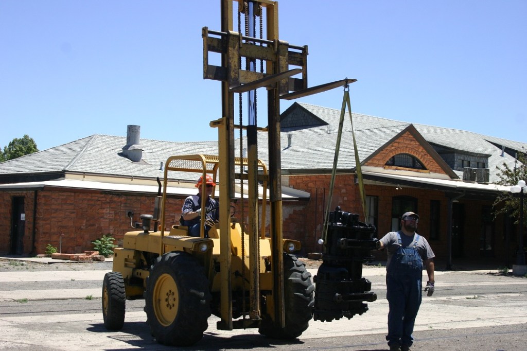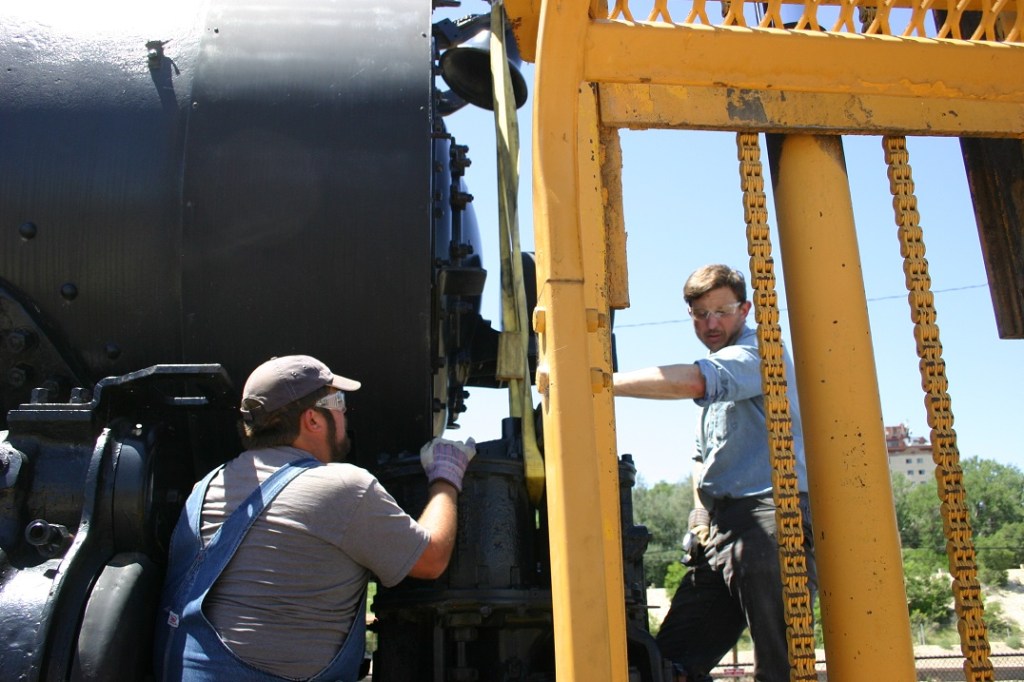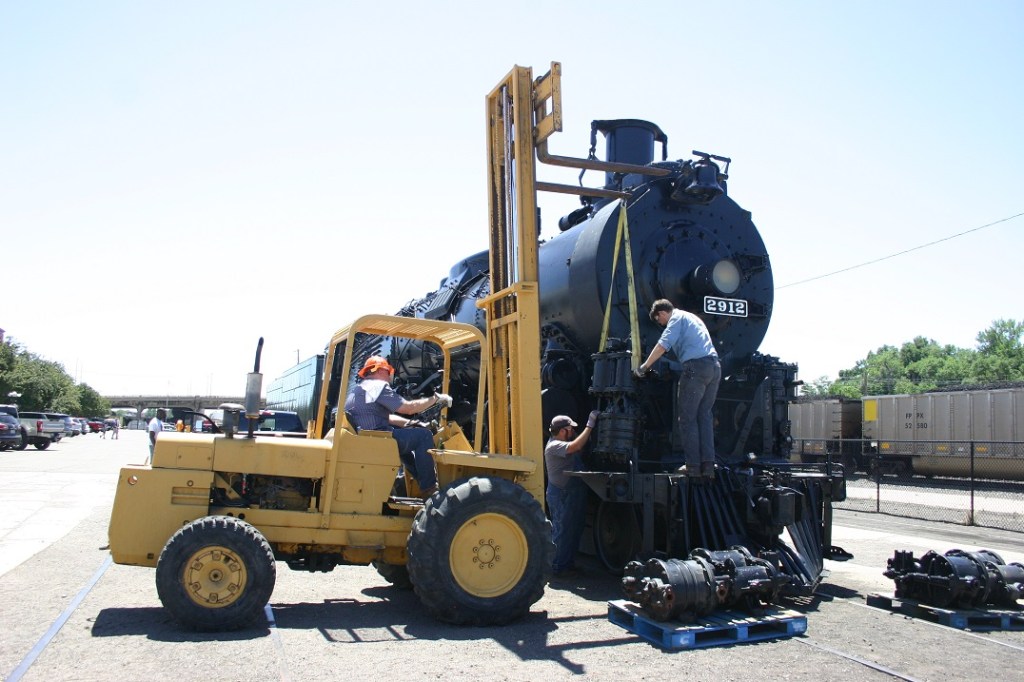 On Saturday, July 9, a small crew from the PRM and a couple of mechanics from the Kentucky Steam Heritage Corporation braved near 100 degree temperatures to make a swap of the air compressors on Engine 2912. This swap was arranged earlier this year to assist the Kentucky group with their restoration of Chesapeake & Ohio 2716. They swapped their used pumps for the rebuilt units that were on 2912. The PRM felt that since 2912 will remain a static display only, then we should help another group who is working to get their locomotive back to running condition.