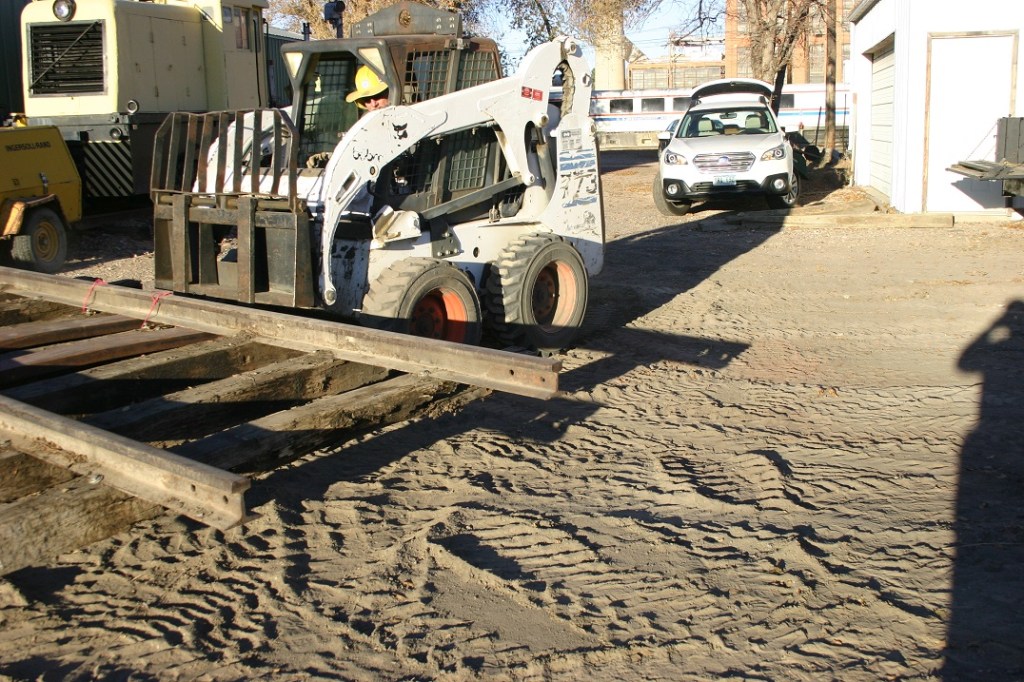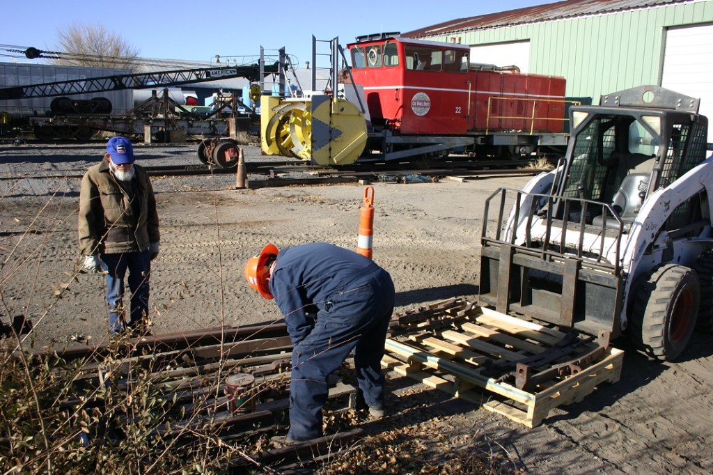 On Saturday, November 19, we had a small crew, Dwight Maxey, Colin Mellin and Paul Brown, continue working on moving material in the shop yard. Today we worked to move some old signal ladders, switch stands and even a short section of track including ties! We started later than normal due to the cold morning temps, but still accomplished a good amount of work. After years of accumulating items, there is quite the collection of things included with the bigger items that only come to light once items are moved.
