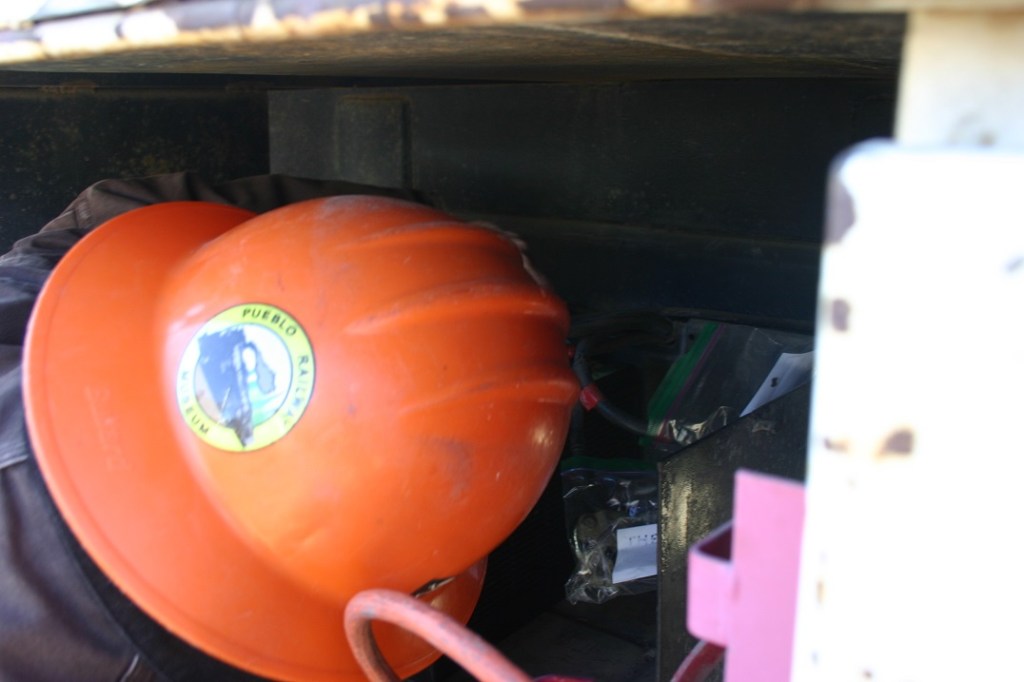 On Saturday, January 7, we had a small group of volunteers tackle the task at hand. Dwight Maxey, Colin Mellin and Paul Brown installed new batteries in our hi-rail maintenance truck, and solved the no-start problem. Colin was able to do some testing earlier in the week to determine that the old batteries were done. Since we didn’t spend as much time troubleshooting this issue, we were able to do some other clean-up work on the truck. There were some items under the dash in the cab that needed to be secured, and we did a fast clean-up in there as well. We operated the small crane, and lowered and raised the rail wheels to make sure everything worked. We did find some hydraulic system leaks that we will have to repair in the future, but now we have a maintenance truck that moves and we can use when we do track repairs. I have included a few pictures to show the truck if you are not familiar with this type of vehicle.
