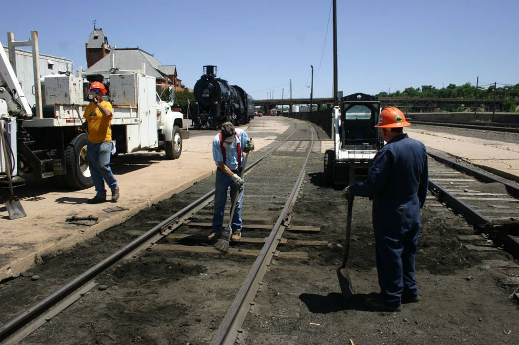 On Saturday, June 24, we had a small crew of volunteers consisting of Dwight Maxey, Colin Mellin, Kendall Crouch and Paul Brown, enjoy a nice warm and dry day getting some track work done. The crew replaced three cross ties that were in bad shape. These were discovered last December during one of our Christmas Train runs. A temporary repair was done then, but we needed to get some healthy ties in place there. The crew made quick work of changing out the ties and even were able to break for lunch.
