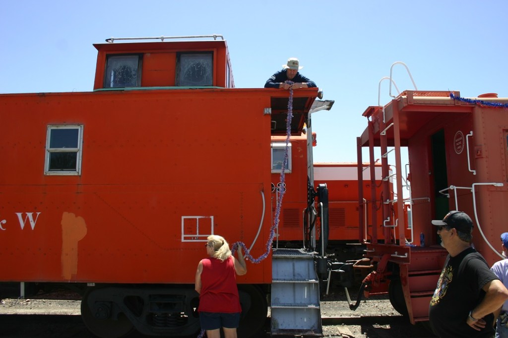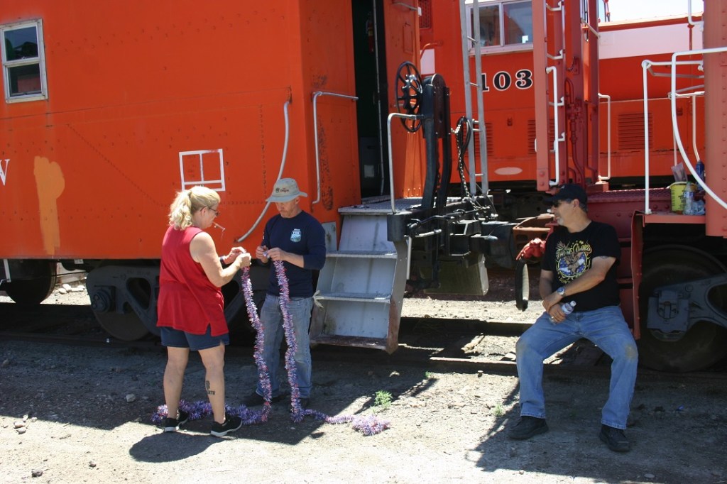 On Saturday, July 1, Dwight Maxey, Colin Mellin, Reid Adams, Bryan Tong, Franklin & Roberta Gherna and Paul Brown reported to the Museum shop area to do some clean up work on our cabooses, and to remove some weed growth from around the tracks that has started to grow out of control thanks to all the recent rains. The cabooses all needed a good wipe down to get rid of dust and dirt inside, and the windows all needed washed. You can now view our fine right of way scenery without the slight haze that had accumulated on the glass. The group also did a bit of decorating for the upcoming 4th of July event on Tuesday.