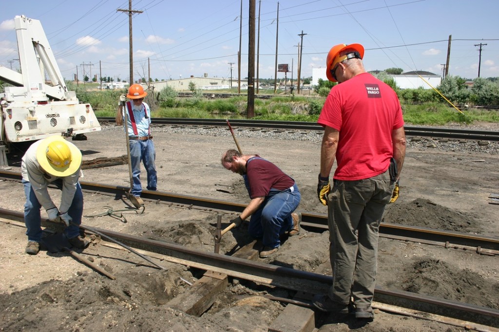 On Saturday, July 8, Dwight Maxey, Colin Mellin, Bryan Tong, Kendall Crouch and Paul Brown accomplished quite a lot of work despite the very humid conditions. We started out by removing the 4th of July decorations from the cabooses and storing them away. Then we gathered some tools and supplies, and headed out to replace two cross-ties in our main running track. We found one old tie completely disintegrated, and the second only about half there, so it’s a good thing we did the work today. After setting the spikes and cleaning up, we headed to the shop for a well deserved lunch break.