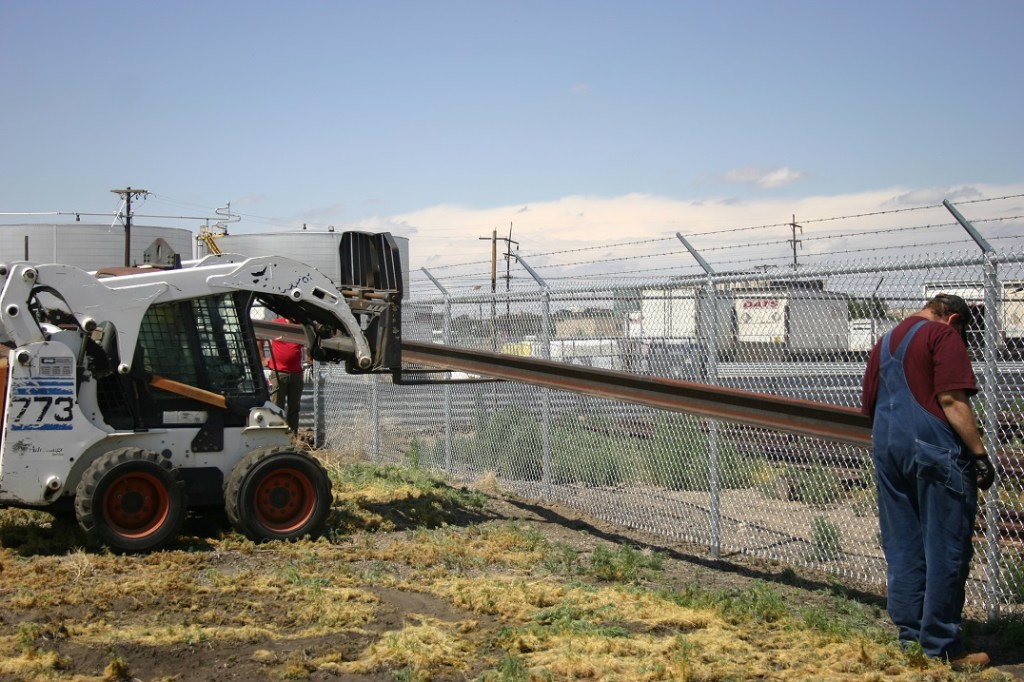 After lunch, we removed one of the drive tires off of the Case Tractor so it can be repaired, and then we decided to work on placing sticks of rail up next to the base of our perimeter fence. This is heavy rail and should help protect the base of the fence. After breaking a pretty good sweat, the crew decided it was time to tie up. The humidity was just getting to be a bit much.