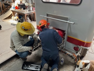 On Saturday, August 5, volunteers Dwight Maxey, Colin Mellin, Bryan Tong, Kendall Crouch, and Paul Brown got busy on several projects to get things ready for next week’s event. First, we had to get Engine 104 started, so we could use it to move Engine 103 and the Santa Fe caboose back, to make room to pull out a couple of our speeders. Next, we had to get the fuel system put back together on the Santa Fe speeder, and then juggle the all of the speeders around to get better access. The big orange Gang Car needed some attention too, so it can make some runs next week. We even had time to pick up some trash from our shop yard in between all the other tasks. There was enough trash to pretty much fill up a 30 yard open top container!