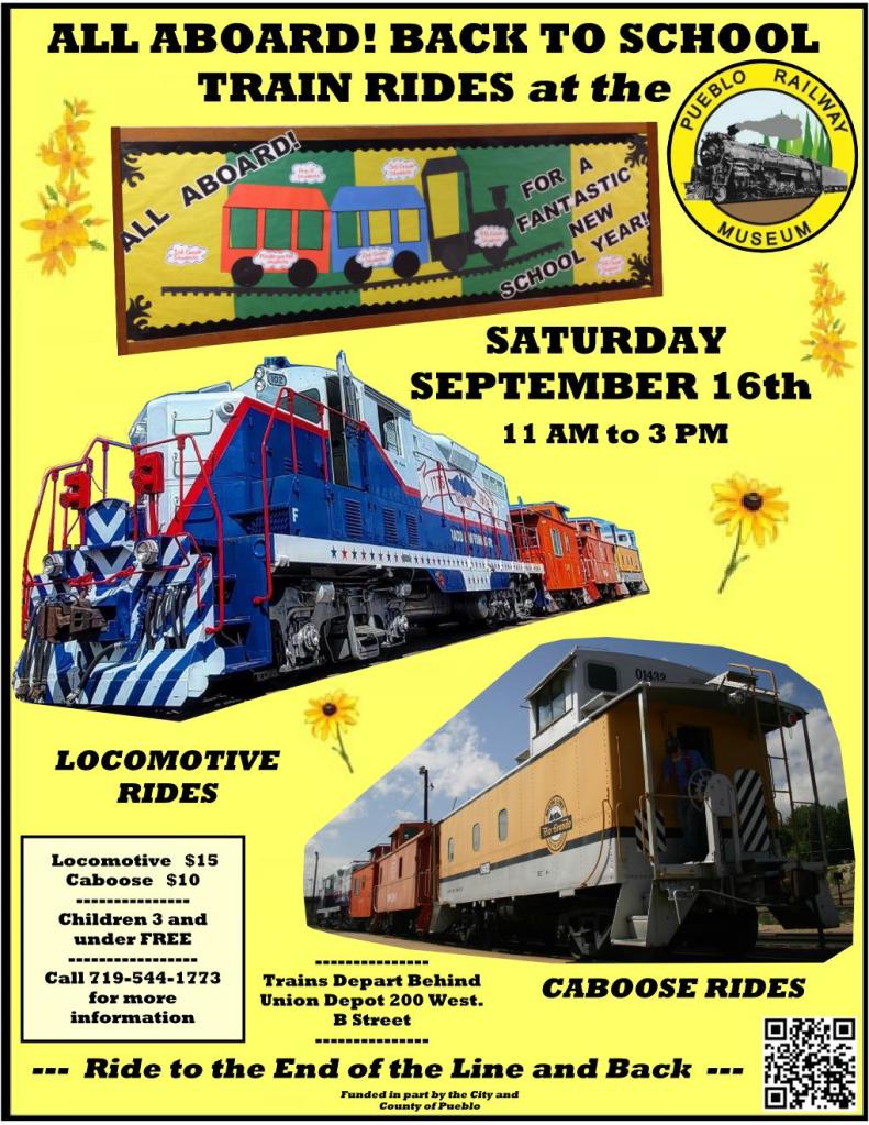Enjoy a train ride on our red, white, and blue “Patriot” engine! This event is Saturday, September 16, from 11AM to 3PM behind the Pueblo Union Depot. Train ride tickets are $15 for a ride in the engine, or $10 for a ride in one of our three cabooses. Children under 3 ride free! Cash or check only, please. Train ride tickets can only be purchased during the event. Purchase your tickets at our Gift Shop, a converted caboose behind the Depot, near where the trains depart. Each train ride is approximately 20 minutes, so there will be multiple opportunities during the four-hour event to ride the trains.