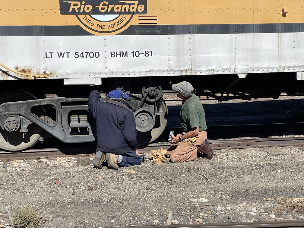 Following a quick lunch break, the whole group moved over to our display steam engine AT&SF 2912, to look at some things that our friends in Albuquerque with AT&SF 2926 had some questions about. This required climbing into the firebox of the locomotive. After this task was complete, we went back to Engine 104 to clean up from the day’s work.