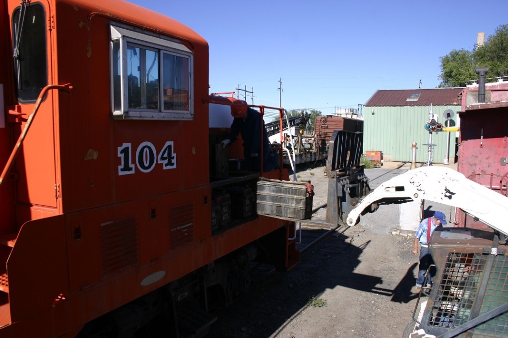 On Saturday, October 7, volunteers Dwight Maxey, Colin Mellin, Bruce Davis, Dannis Hudson and Paul Brown jumped on both of our scheduled projects. Dwight and Bruce concentrated on mounting junction boxes under our cabooses, to prepare for the power wire from our generator. These boxes will allow us to distribute the power from car to car, and provide the power for interior lights and exterior decorations. Meanwhile, Colin, Dannis and Paul concentrated on removing the cranking batteries from Engine 104. This required removing access doors, and unbolting the large cables from each battery. We were then able to lift the batteries out with the Bobcat. This is half the work required on this project. Next, the battery boxes need to be cleaned up, and flooring repaired to support the replacement batteries.