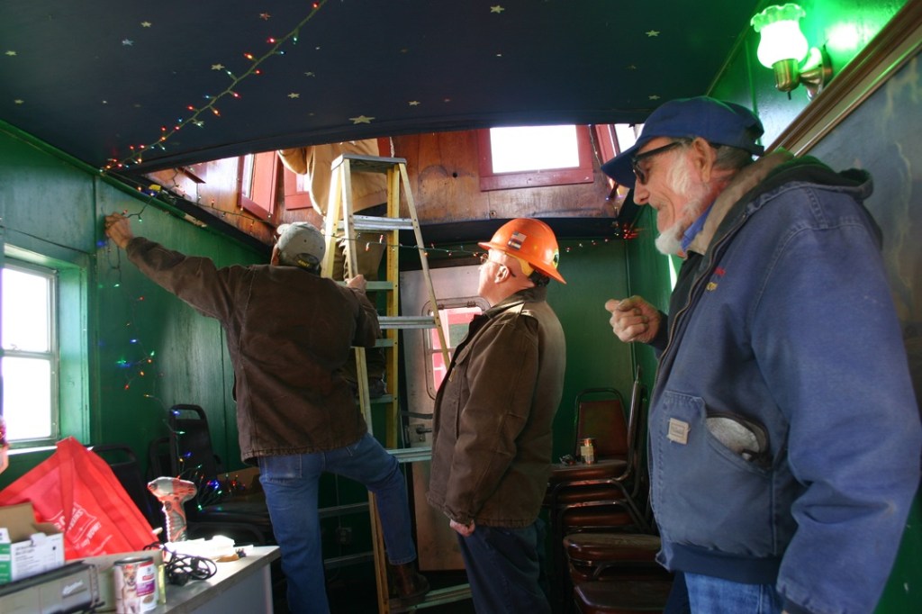 On Saturday, December 2, a group of volunteers once again braved less than ideal weather to get decorations done on our train set. Dwight Maxey, Colin Mellin, Bruce Davis, Kendall Crouch, Dannis Hudson, Polly Cotton and Paul Brown were able to finish installing Christmas lights – provided by Reid Adams – on the locomotive and the rear of the Rio Grande caboose. The interiors of the cabooses also got a few more lights, and some decorations were added. We should be ready now for our event trains coming up on the next three weekends. Now, we keep our fingers crossed that our locomotive starts and we have nice conditions!