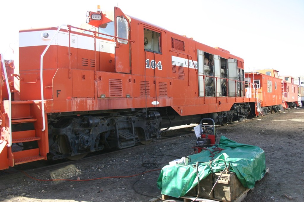The crew took a quick lunch break, and then got back to work cleaning up the batteries that we scattered all over, and then did some minor work on Engine 104, including replacing a brake shoe on the number 3 axle and working on the bell. Then we spent some time running the train set around on our running track and checking out equipment operation.