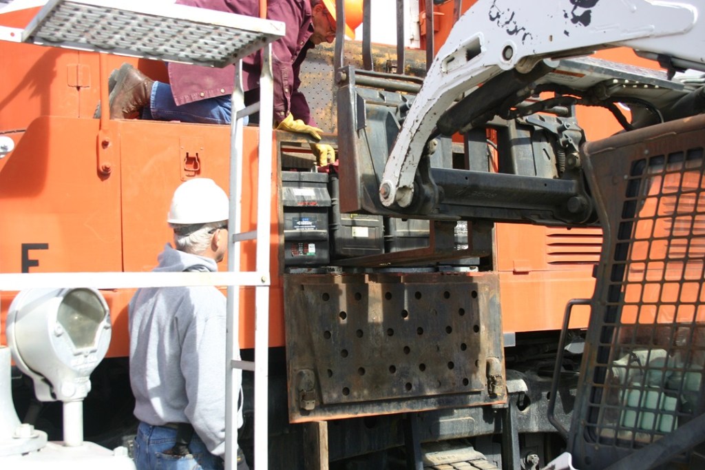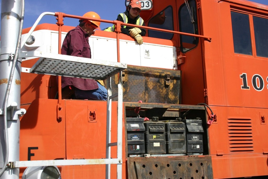 On Saturday, March 23, volunteers Dwight Maxey, Colin Mellin, Kendall Crouch, Bruce Davis, Dannis Hudson and Paul Brown worked to get Engine 104 started and checked out for next weekend’s event. After setting up the jump batteries, and following Dwight’s work to charge those batteries several times earlier in the week, we had a successful start on the locomotive. While waiting for the engine to warm up, the group worked to remove batteries from Engine 103. We are in the process of replacing batteries on engine 104 and two of the batteries on Engine 103 are pretty new and will be used as part of the replacement set. Engine 103 will be out of service for an undetermined time, so it was best to remove all the batteries for now. The group then moved Engine 103 onto another of the shop tracks to keep it out of the way for future operations this season.