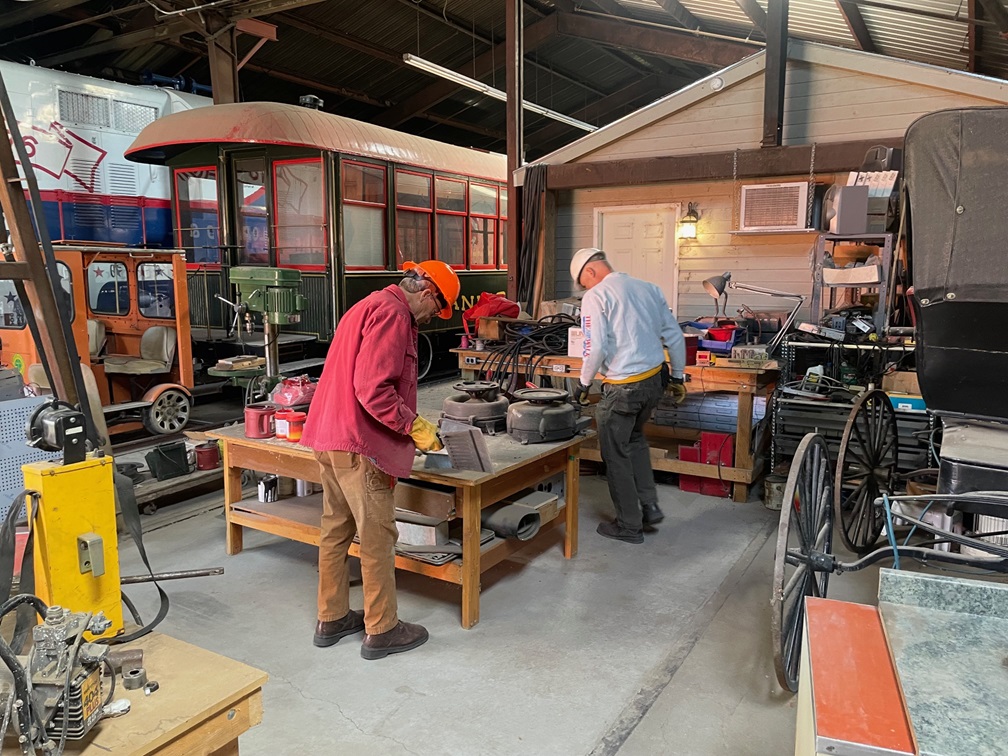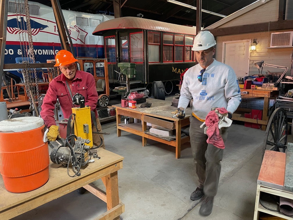 After a lunch break, we split up and tackled a couple different projects. Bruce, Kendall and Colin worked to figure out the cupola window problem in our Rio Grande caboose. Though this car looks pretty good, it is old, and thus has problems with moving parts and such. After about an hour of effort, they had the windows operating better, but found even more issues that will need a little attention in the near future. Chris and Dwight did some work to the wiring for a set of connectors on our locomotive battery charger to improve the hook-ups for the jump batteries on the ground. Paul was spotted walking over to the Depot display area to find other problems that will need attention in the future.