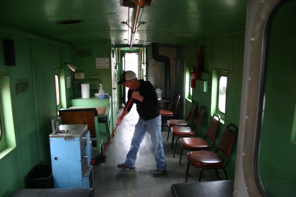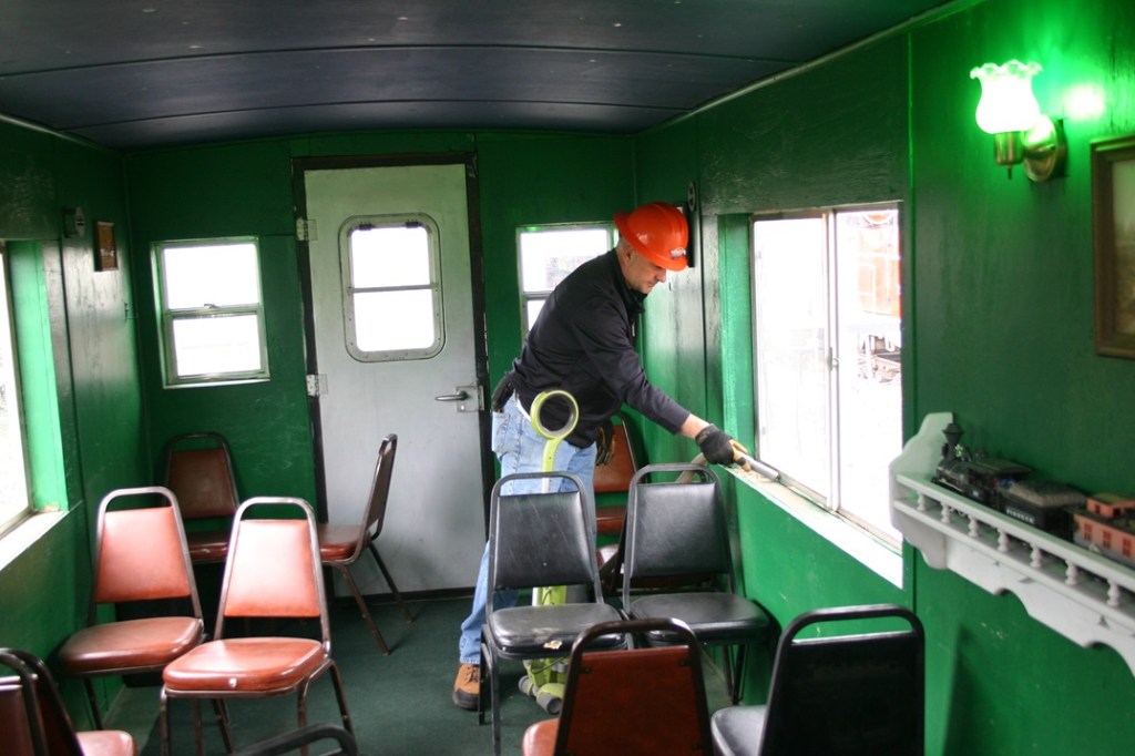On Saturday, May 11, volunteers Dwight Maxey, Colin Mellin, Kendall Crouch, Bruce Davis, Chris Pollard, Gary Carter, Reid Adams and Paul Brown dodged rain showers while first working to clean up our caboose fleet to get them ready for next week’s train ride event. Kendall and Reid took on the bulk of work sweeping, vacuuming, wiping down surfaces, and even mopping the floors. Meanwhile, Bruce and Chris started working on the Hi-Rail truck to try to finish removing rear wheels and to remove a hydraulic cylinder from the knuckle boom crane on the rear of the truck. This has been an ongoing battle with rusted lugs and bolts. One end of the crane cylinder was easy work, but the other end had bolts that just weren’t budging, so while those were soaked with penetrating oil, the gang turned to the wheel lugs.