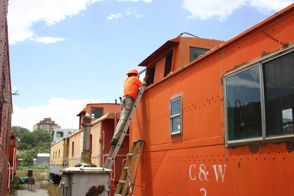 After lunch, we did some various work around the shop. Chris was seen cleaning up a tree branch that had fallen out of our large elm tree. Bruce was found installing windows that he rebuilt into the C&W caboose. Dwight worked on repairing a deadbolt lock on the AT&SF caboose. Abel was seen assisting all three through the afternoon.