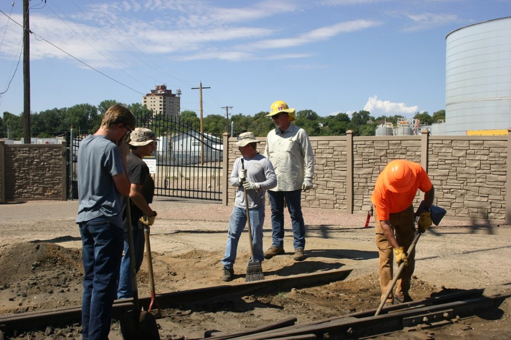 On Saturday, July 27, volunteers Dwight Maxey, Colin Mellin, Kendall Crouch, Bruce Davis, Reid Adams, Dannis Hudson, Henry Falko and Paul Brown spent the day moving dirt and gravel. Our first task was to clear out some more gravel and rock from our main running track over by the power plant near the end of our run track. This was a continuation of a long standing project to open more track to run on, and to be able to inspect and replace ties. The crew worked well in the heat, and we were able to clear up three different areas on the main track.