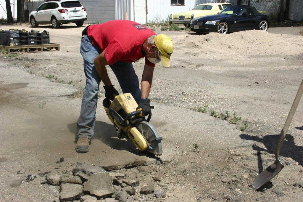 We then took a quick lunch break and then jumped into the second project. We are going to start building out the track that will allow access to the street car we have stored in the shop. The area outside of this stall has an asphalt pad, so we want to save as much of this as possible. Today’s work consisted mostly of cutting the asphalt for a clean edge. We did start to remove some of the asphalt to see what surprises the ground underneath held. The initial plan for this track will be to get about 80 feet built out away from the shop, so watch for more work to come on this one!