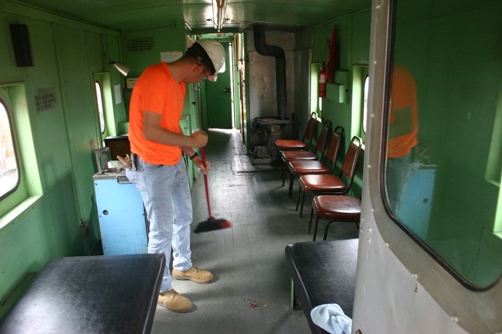 On Saturday, August 10, volunteers Dwight Maxey, Chris Pollard, Ben Pollard, Christopher Traficante, Dannis Hudson and Paul Brown worked to clean and check equipment in anticipation of our train ride event next Saturday, 8/17. The crew started by getting a couple of “speeders” out of the shop and giving them a bath. You can’t expect anyone to ride on equipment that has a year’s worth of dust on it!! After washing this equipment off, we did a once through of the cabooses, cleaning windows, wiping clean seats, and sweeping the floors.
