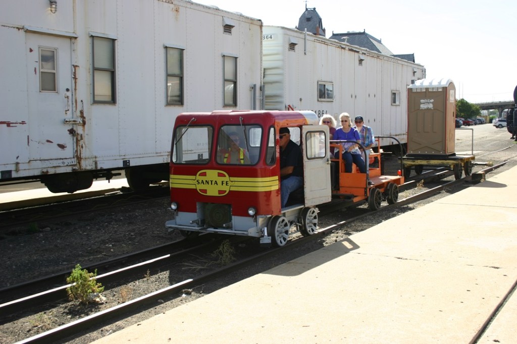 On Saturday, August 17, volunteers Ron Roach, John McDowell, Polly Cotton, Dwight Maxey, Colin Mellin, Reid Adams, Kendall Crouch, Bruce Davis, Chris Pollard, Ben Pollard, Dannis Hudson, Henry Falko, Abel Erber and Paul Brown all braved the heat (only 100!) and brought out our regular train set, as well as a little motor car treat for our visitors to ride. After a nice cool start, and getting the equipment ready to roll out, we were greeted by a fairly steady crowd of visitors as the event started a little before 10:00am. A few folks opted to jump on the motor car and take a very open air trip around on our main running track. It seemed like most of our visitors were really wanting to ride in the locomotive, because the cab was stuffed on almost every trip!