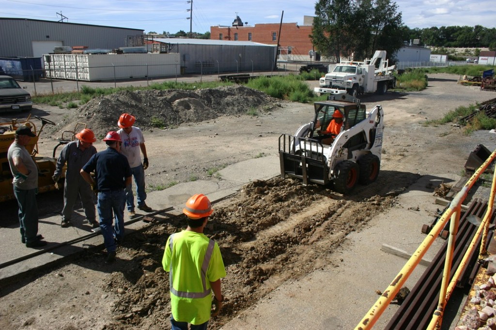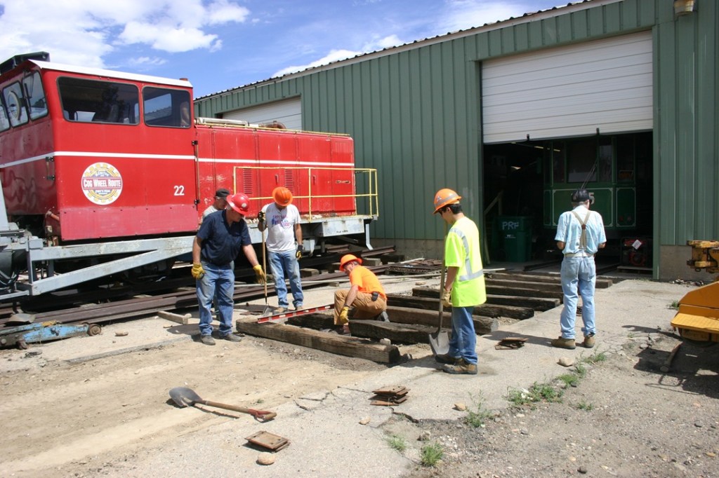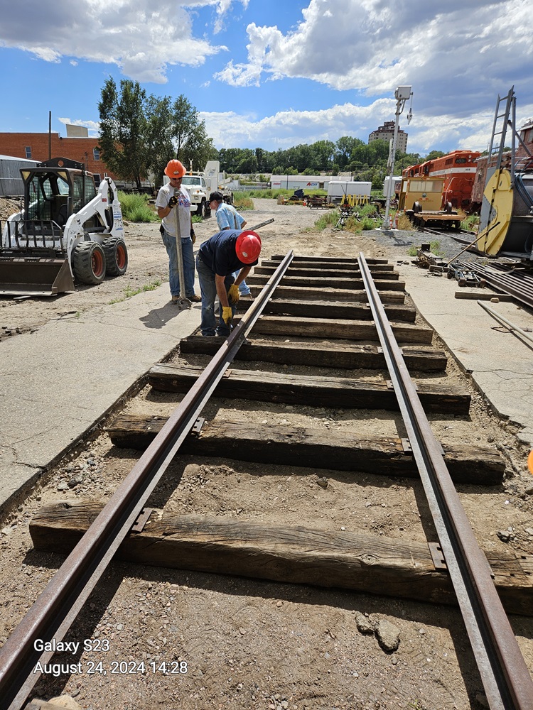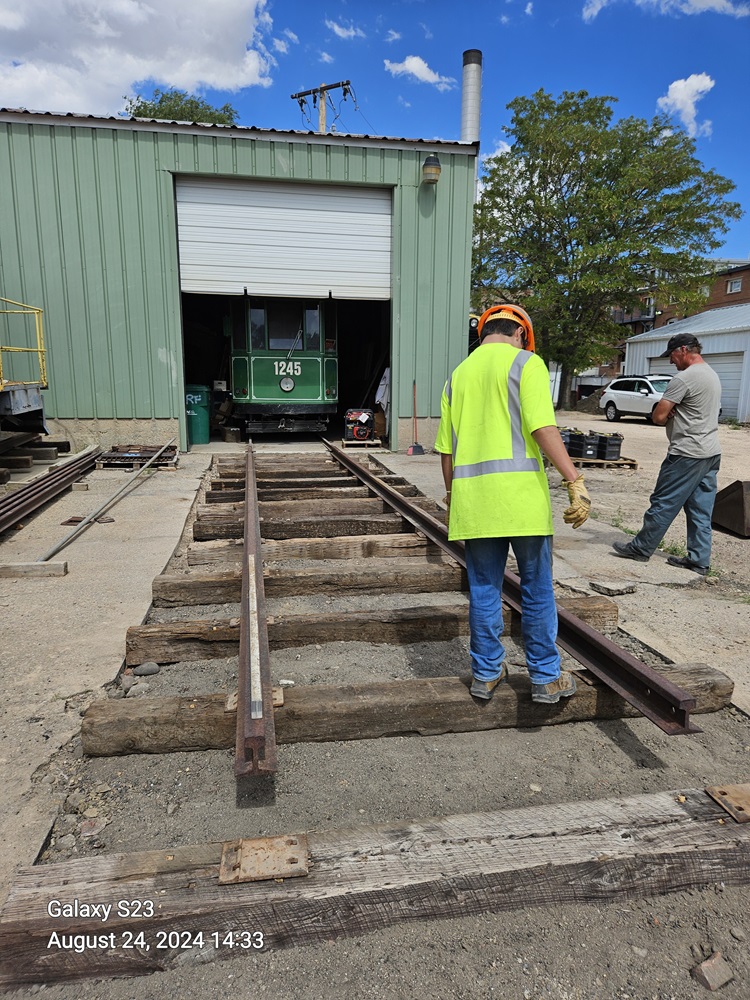 On Saturday, August 24, volunteers Dwight Maxey, Colin Mellin, Kendall Crouch, Bruce Davis, Chris Pollard, Dannis Hudson, Russ Lippincott and Paul Brown broke a sweat working at the Museum! The group continued work building the track that will lead out of the stall where our streetcar is stored. We finished some dirt work required, and then picked out some ties which were then positioned to support the rails. Before a break for lunch, a couple of rails were located in our stock and brought over to the project area.