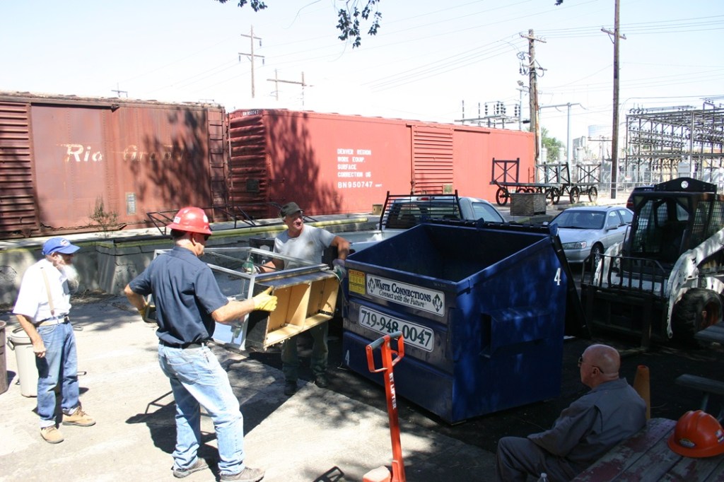 On Saturday, September 7, volunteers Dwight Maxey, Colin Mellin, Chris Pollard, Russ Lippencott and Paul Brown did some overdue housekeeping at the Museum Shop. Like any good railroad museum, items are brought to us and we always think we will find a use for those items. Then you start working on projects, and the items just end up sitting around gathering multiple inches of dust!! Well, today we did some work to decide what needed to be thrown out and what needed to stay. When an item is going to stay, it must find a place to hang out different from where it has been for the last year or two! We managed to throw out enough stuff to fill a 4 yard trash dumpster, and rearrange the junk that is staying until the next clean up!