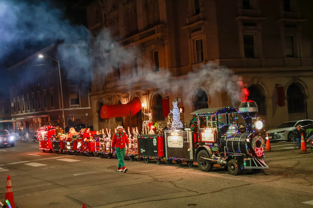 The Pueblo Railway Museum’s tour guide Ron Roach will be driving the train, which was originally built in 1942 as an airport tug and luggage cars. Ron and Museum volunteer John McDowell brought this train back to life following its acquisition by the Pueblo Downtown Association last year. An agreement has been made with the Pueblo Railway Foundation that the Pueblo Railway Museum would store and operate the train and keep it running. The train has sets of cars with many different themes. The train has made many appearances during our Museum’s train ride events for the last two years as a “static” display, but the Parade of Lights is your only chance to see the train in action!