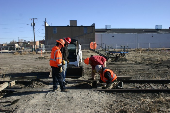 After a lunch break, the crew headed back out to repair some damage that was done to the dirt crossings that we installed a few months back. Some contaminated material was deposited on the crossings and it blocked the flangeways. The crew dug out the offending material, and then fabricated end blocks from 6X6 timbers to box in the material. After finishing this work, the crew cleaned up all the tools used, and finished up before the cold wind started blowing.