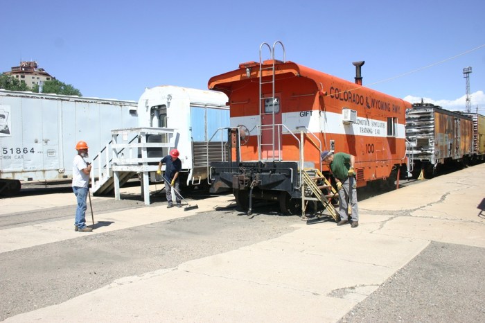 On Saturday, June 28, volunteers Dwight, Bruce, Chris, Kendall, Doug and Paul braved very warm and humid conditions to get our cabooses and Engine 102 further cleaned up for the upcoming 4th of July event next Friday. A vacuum was used and the window cleaner was sprayed, and in about an hour that work was done. The crew then headed over to the platform tracks near Union Depot to clean up some weeds that had blown in from the North. After some fast work to get this done, we headed back to the shop and were treated to a great hamburger lunch by Doug.