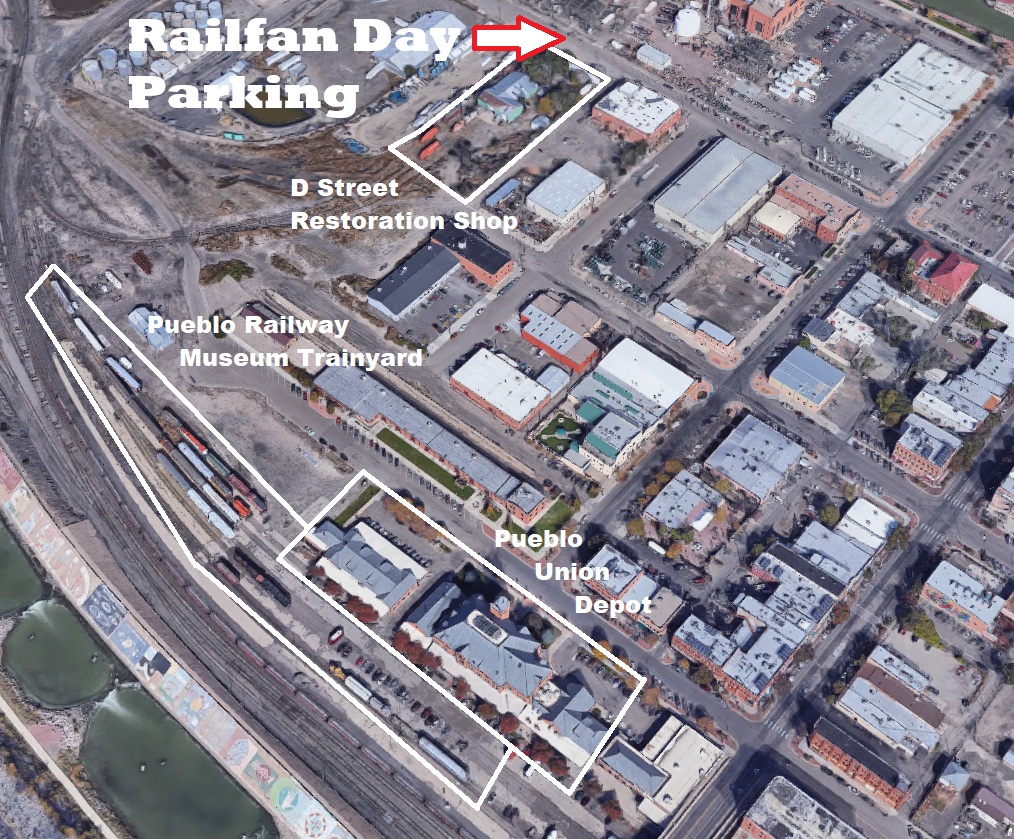 Visitors to this event should arrive at our maintenance shop at 330 West D Street, about two blocks north of the Pueblo Union Depot. From the Pueblo Union Depot, take Victoria Avenue northeast to D Street, turn left, then two blocks northwest on the left. Click here for a map. Click here for Google Maps directions.