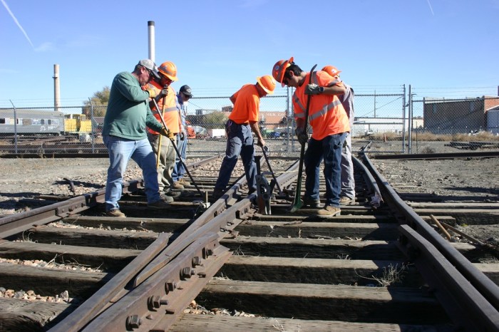 On Saturday, November 15, volunteers Dwight, Colin, Bruce, Jerod, Dannis, Nick, and Paul got busy doing some cleaning in the cabooses to be ready for our event next weekend. The windows and floors got the most attention, with the floors even getting mopped! After the cleaning was finished, we headed out to the switches on the shop lead tracks to raise and secure a piece of track through the switch points. The crew learned how much work it is to tamp a bit of rock under cross ties! We were able to lift one rail enough to line up better with the switch point, making it easier to throw the switch.