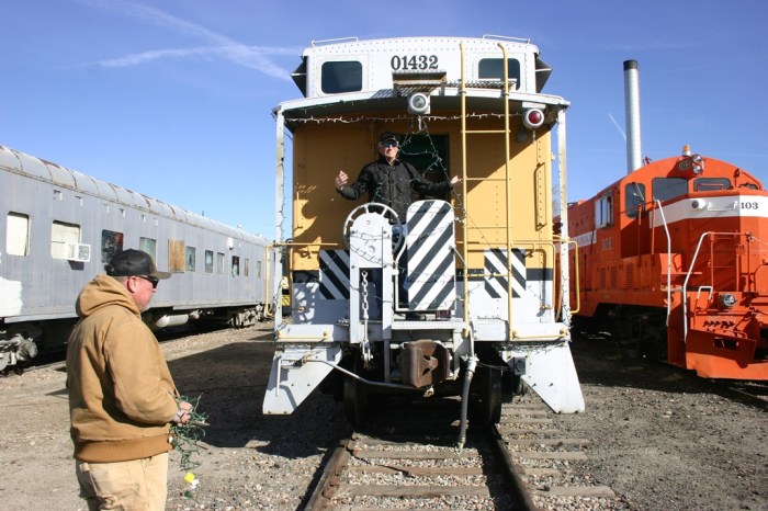 On Saturday, November 29, volunteers Dwight, Colin, Bruce, Chris, Thomas, Jerod, Polly, Dannis and Paul braved some very chilly conditions to start decorating the trainset for our upcoming Christmas events in December. Everyone jumped in to untangle the light strings, test for burned out bulbs, and climb ladders or up on the equipment to get the decorations installed. Polly did her magic working on decorating the caboose interiors, while Dannis and Paul stocked in some firewood for the stoves. Bruce continued work on the interior cabinet doors in the C&W caboose. Chris, Thomas, Dwight and Colin figured out all the electrical connections to power those lights. This year we set the lights up for a new look on the locomotive. It is good to get the decorating work done, but it was even better to call it a day and get inside to warm up!!