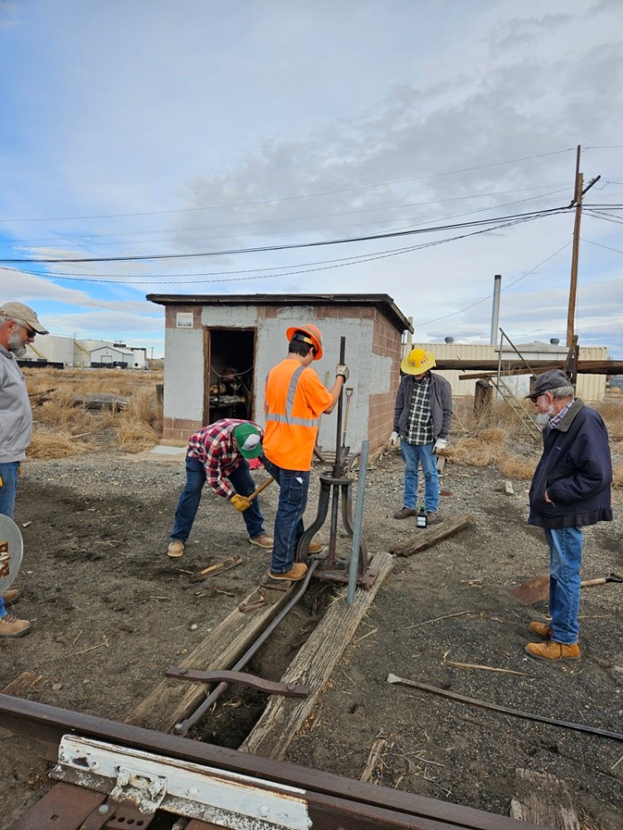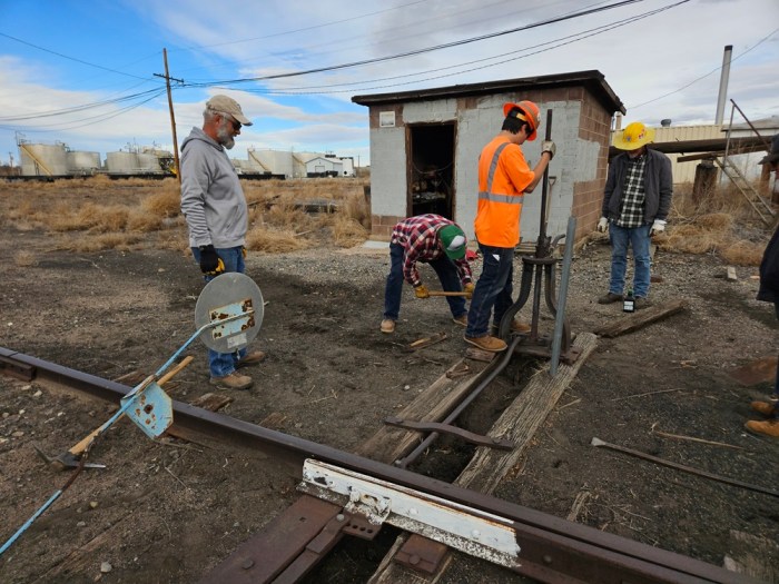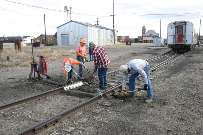 After a leisurely lunch hour, we headed out to work on cleaning out a couple of switches near the collection area that will be used in the next couple of weeks for some equipment moves we have planned. The two switches don’t get used often and it has been a couple of years since they were last moved. Wind blown dirt can get into the strangest places in moving equipment! Now these switches are ready to work, and we will use them very soon to get some equipment out for an upcoming event.