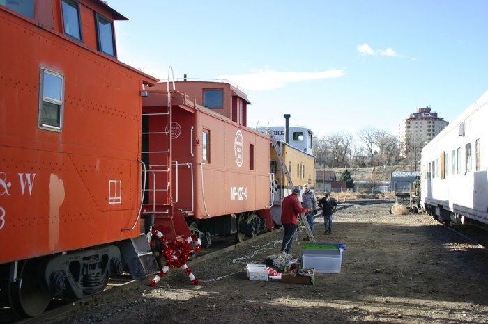 On Saturday, December 27, for our last work day of 2025, volunteers Dwight, Bruce, Jerod, Polly, Dannis, Kendall and Paul first worked on removing the Christmas decorations and lights from our train set, and getting them properly packed and stored away, ready for use next year. A little clean up was done inside the cabooses, and then we worked on the generator, which needed some clean up and an oil change.