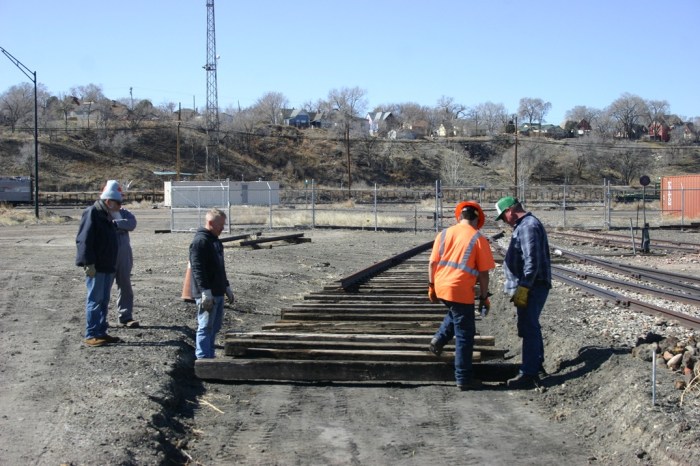 On Saturday, February 21, volunteers Dwight, Colin, Dannis, Reid, Jerod and Paul started the day with warming up some equipment after an overnight low in the teens. Once the equipment started moving without any groans, we were able to gather some cross ties and get them placed along the ground prepared for track that we worked on last week. The gang then plugged the holes in the ties before gathering a bunch of tie plates to spread out. After a lunch break, we returned to dig out two sticks of rail and get them in place for future work to spike them down. We finished the day moving some more equipment around in the yard before calling it a day.