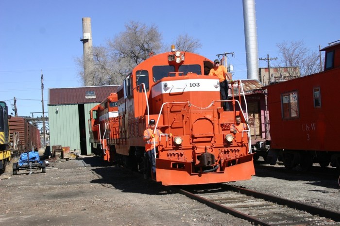 While bringing Engine 103 back into the shop to tie up, we suffered a minor derailment on a sharp curve leading into the shop yard. So it turned into a training event for some of the volunteers, to learn what is needed to rerail a locomotive. We successfully got the engine back on the track, repaired the rails to keep the incident from happening again, and were finally able to tie up about an hour later.