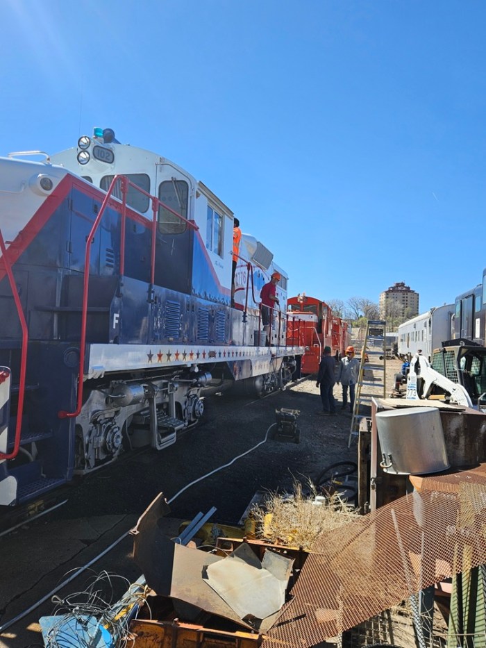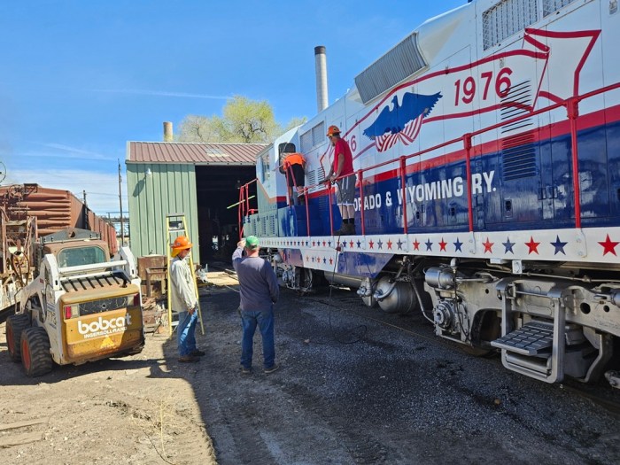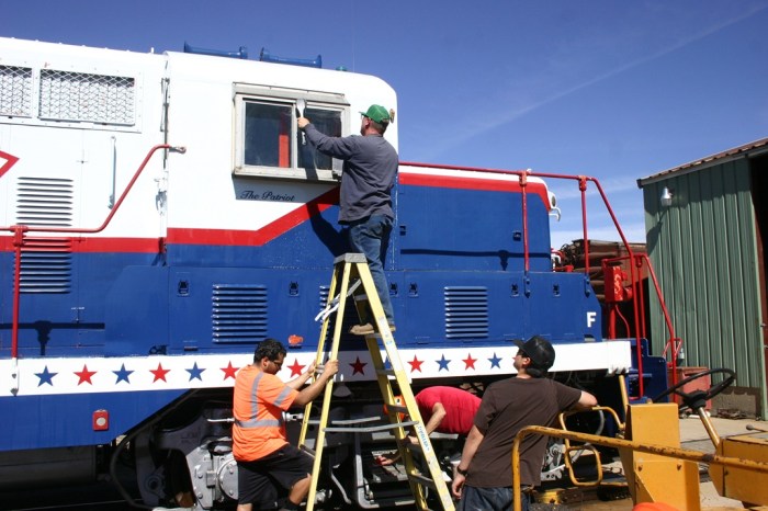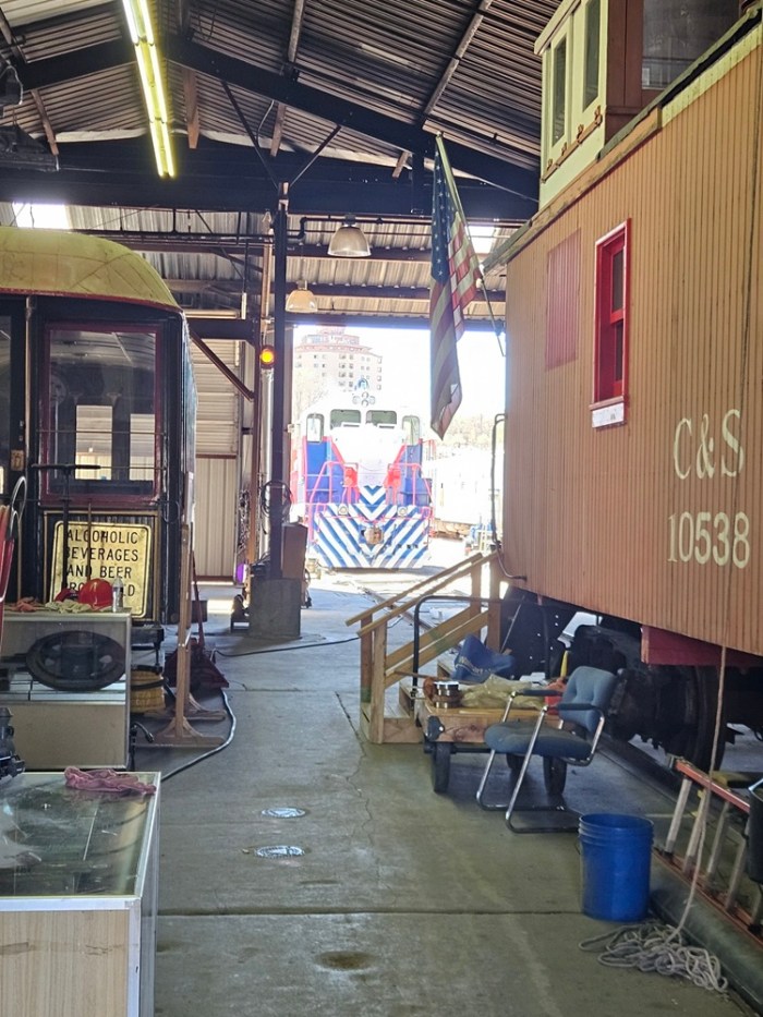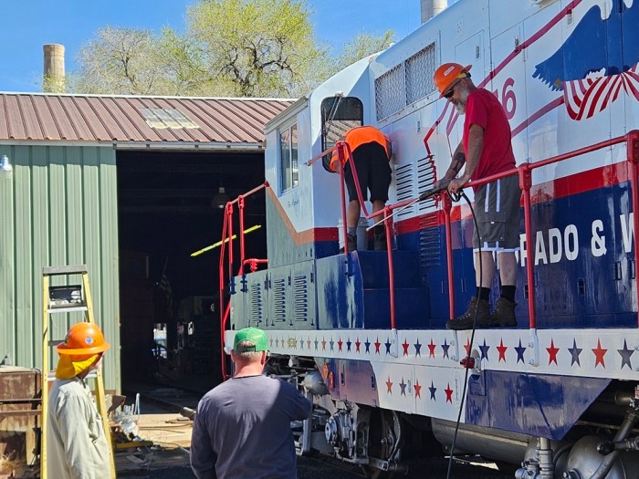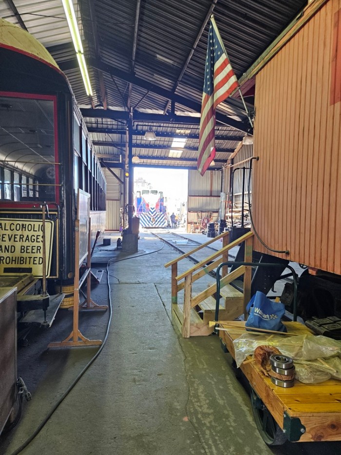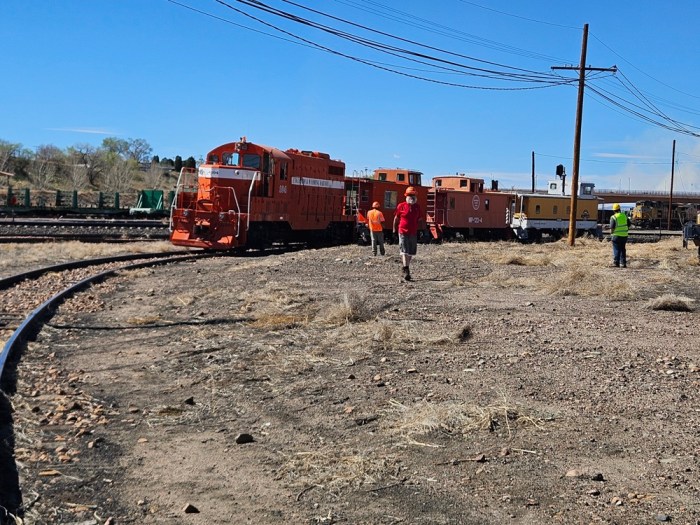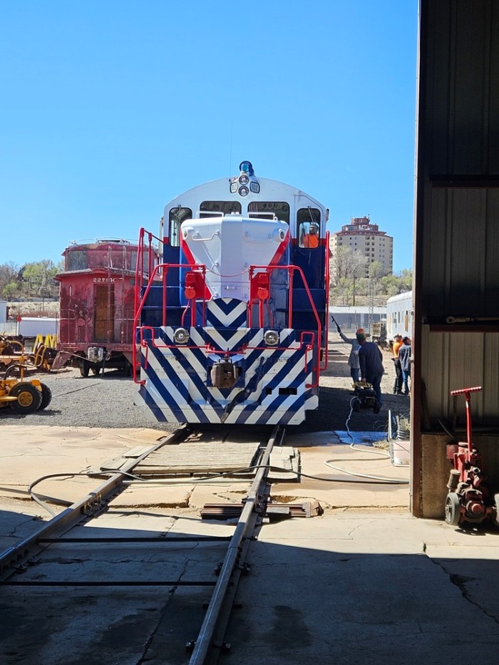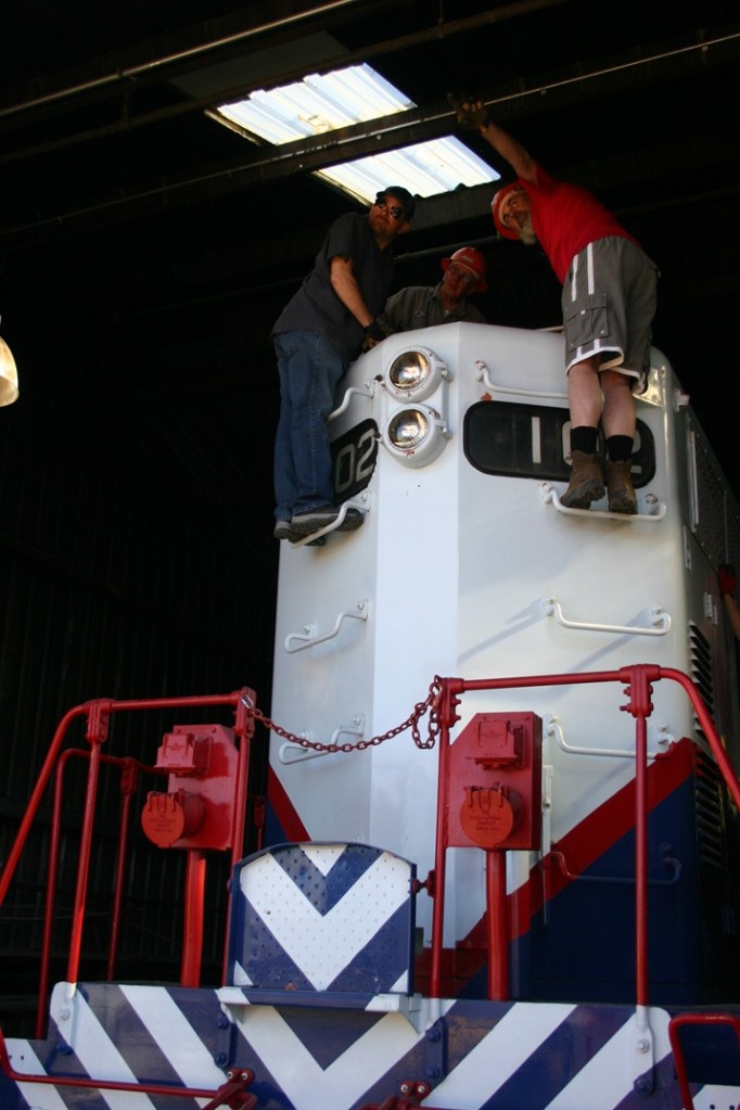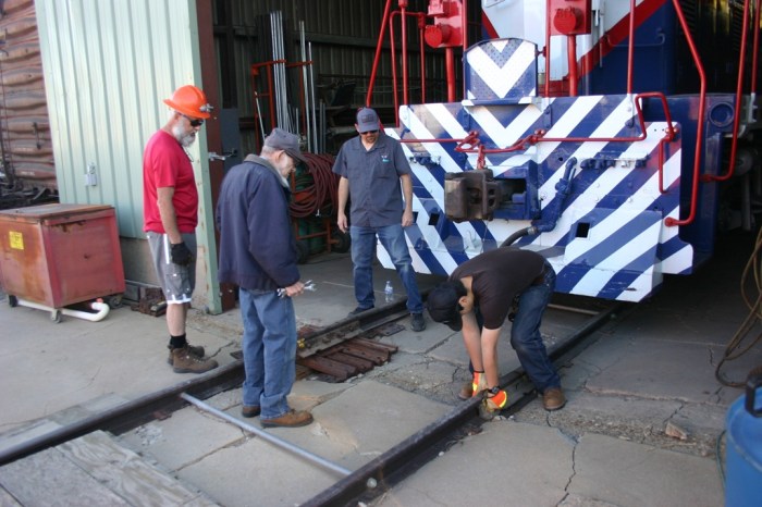 On Saturday March 21, volunteers Dwight, Kendall, Jerod, Ben, Dannis, Bryan, Nick, Nick (yes two separate Nick’s!), Bruce, Colin, and Paul got busy early, on what promised to be a hot and very busy day. The main goal of the day was to get Engine 102 ready for use over the next six months. We started out by getting Engine 104 started and ready to move. Then we added coolant and changed fuel filters on Engine 102. We had got the track connections done earlier, so it was time to pull 102 out and give her the annual wash job. A rotating group worked on washing the locomotive, while another group cleaned the shop floor where 102 had sat during the winter. This work got us up to lunch time and we took a quick break.