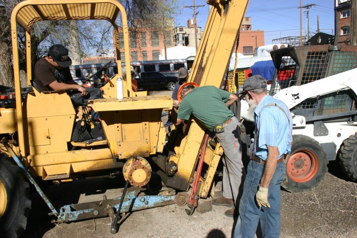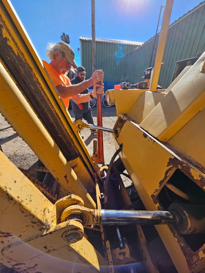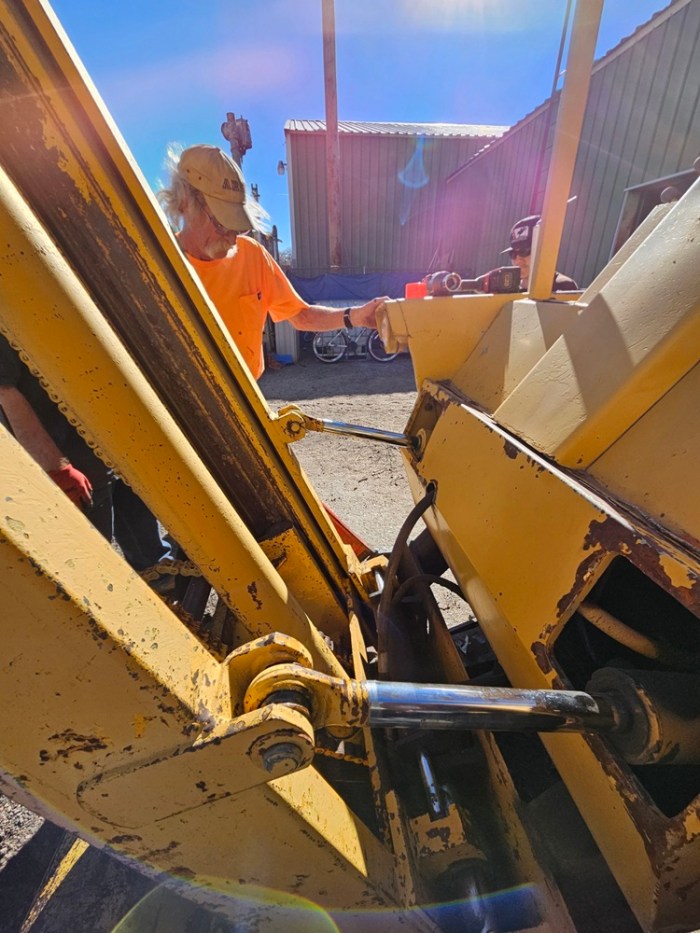 After lunch, it was time to get Engine 102 started and checked out. While she was warming up, the windows were cleaned and the wash equipment was put away. We also added lube oil to the engine after it warmed up. It only took 40 gallons to top her off! Then we backed Engine 104 and the three cabooses out around our sharp curve, to check out the track work we did there last week. Everything looked good, so it was time to park 104 out of the way and get 102 hooked up to the cabooses to be ready for the upcoming events. Things were going very well, so we decided to do some more work, which included adding an accessory to Engine 102, and working to repair a problem that was spotted on our Massey Ferguson Forklift. We finally wrapped up around 6:00pm, a rather long day for the Museum volunteers.