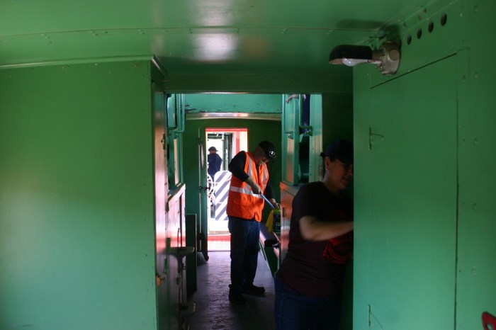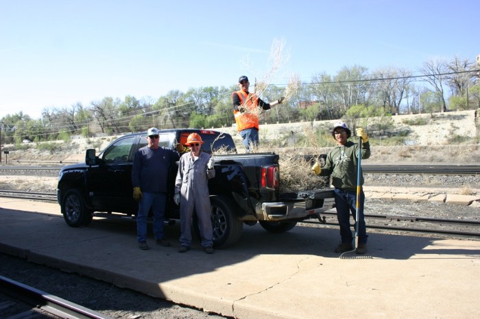 On Saturday, March 28, volunteers Dwight, Colin, Bruce, Jerod, Nick, Reid, Gabriel, Sandra and Paul enjoyed the excellent early Spring weather by doing the MOST IMPORTANT work we do at the Museum, cleaning up blown-in tumbleweeds from around our equipment. Today’s crop was rather light, with only two pickup bed fulls to mash into the dumpster. While over at the collection area, we were able to install some wash out plugs back into the 2912’s boiler. Upon returning to the shop yard and dealing with a few more weeds and filling our dumpster, the crew did a thorough cleaning of our cabooses to be ready for next week’s event. Then it was lunch time.