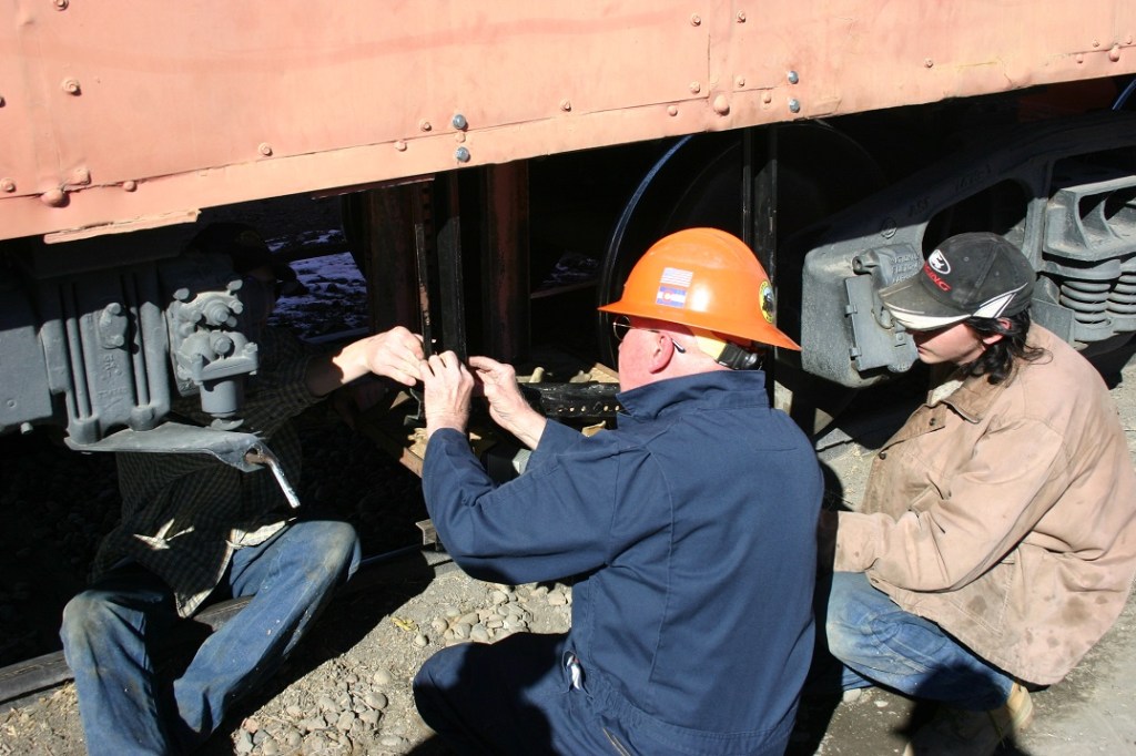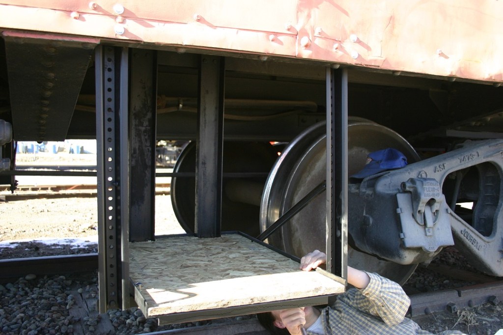 On Saturday, March 12, Colin Mellin, Kendall Crouch, Tyler Seeley, Tanner Seeley, John McDowell, and Paul Brown got busy and removed one of the trucks out from under C&W Caboose #3, to replace the brake beam and hook up the brake linkage. We used a nice set of air operated jacks we have in the shop to raise the car, and then rolled the truck out. The team came up with a good idea to use a stick of 40# rail and two track jacks to raise the truck up enough to roll an axle out of the way, and allow open access to the brake beam. We were able to reinstall the part properly and put the wheels back in. After a quick lunch, the crew came back to roll the truck back under the car, and reattach the remainder of the brake rods to allow full use of the brakes. We then reattached the steps to finish the job.
