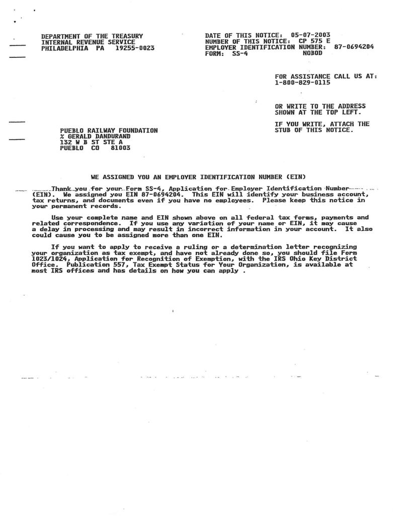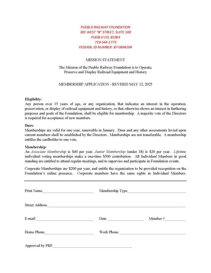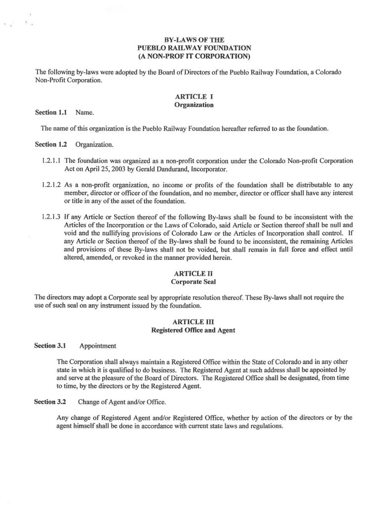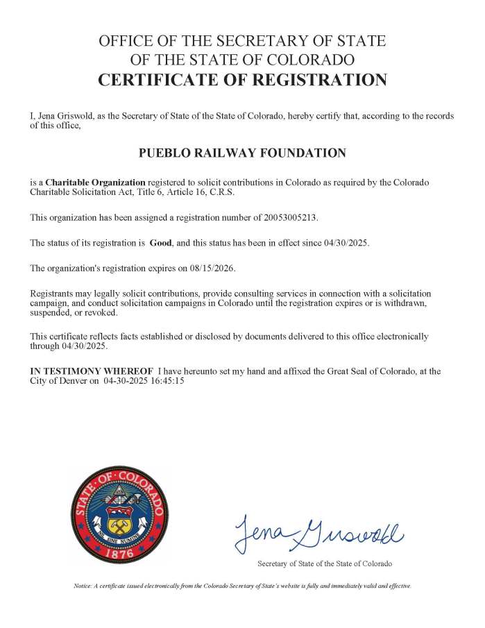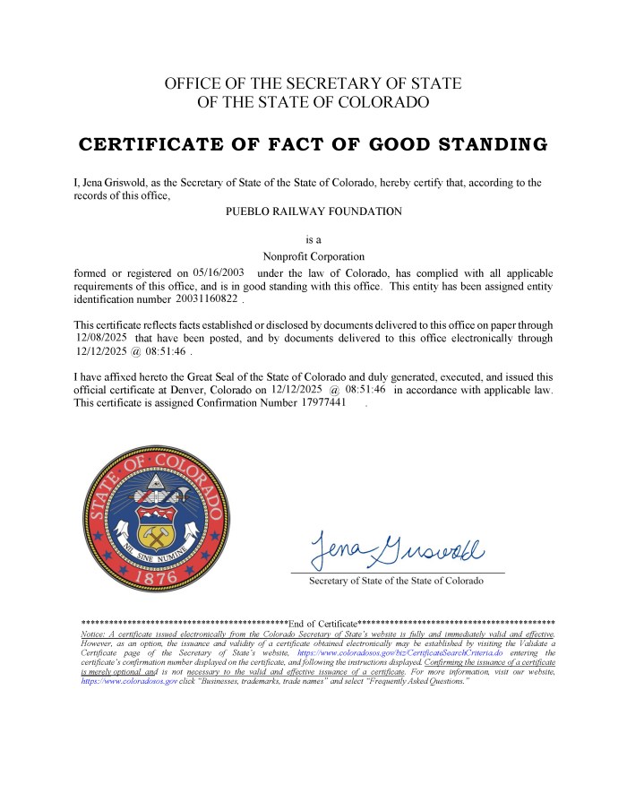 Documents Click on an image below to download the PDF file. Articles of Incorporation Certificate of Registration Certificate of Good Standing EIN Assignment Tax Exempt Letter Certificate to Transact Business Organization By-Laws Membership Application DONATE Copyright © 2025, Pueblo Railway Foundation FEEDBACK