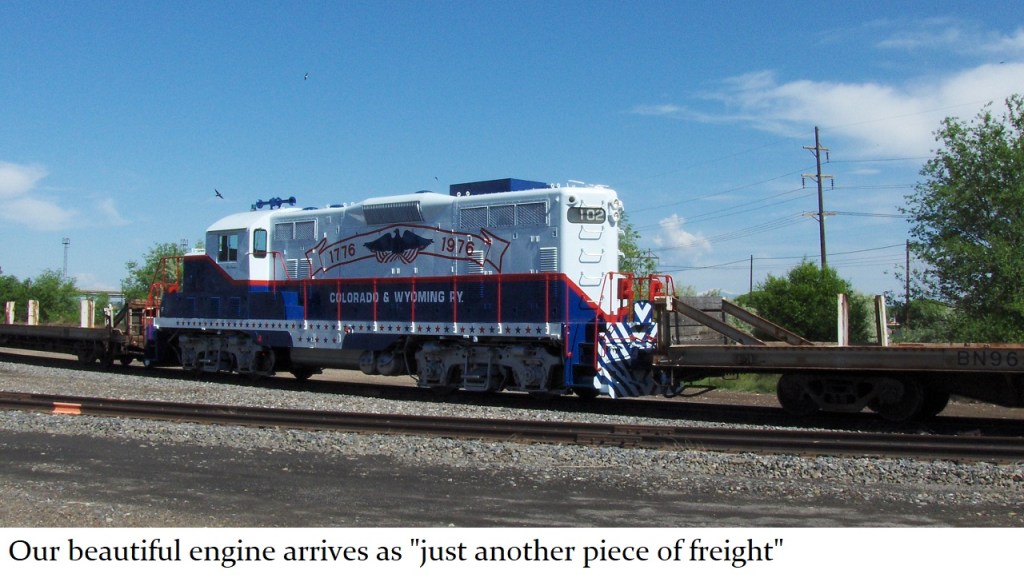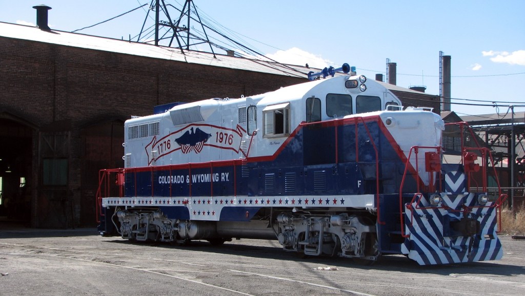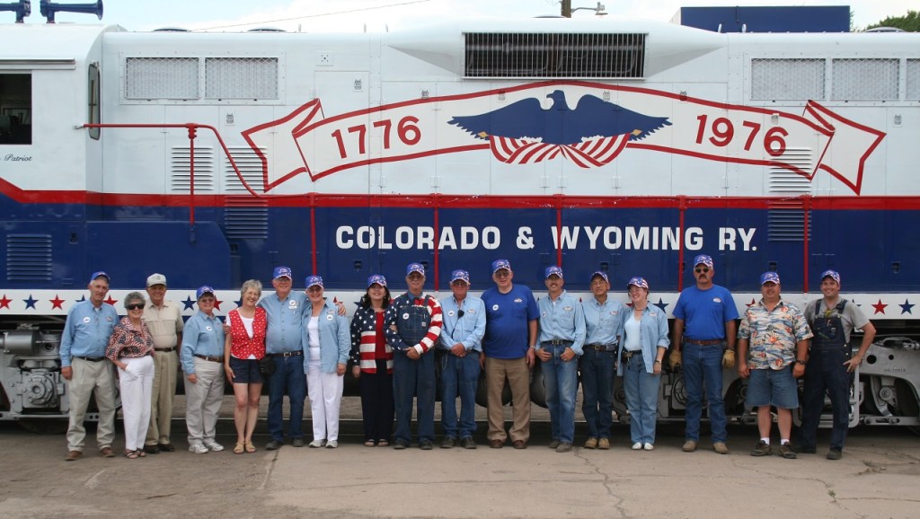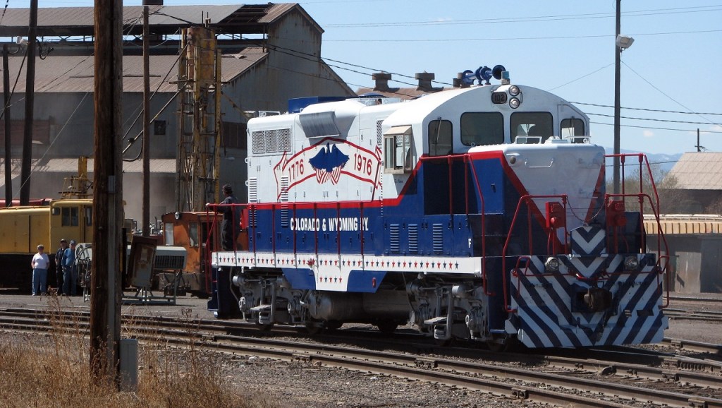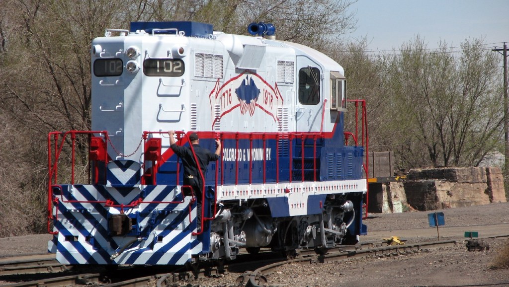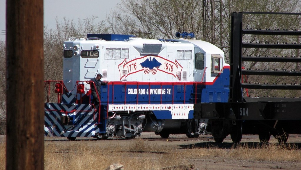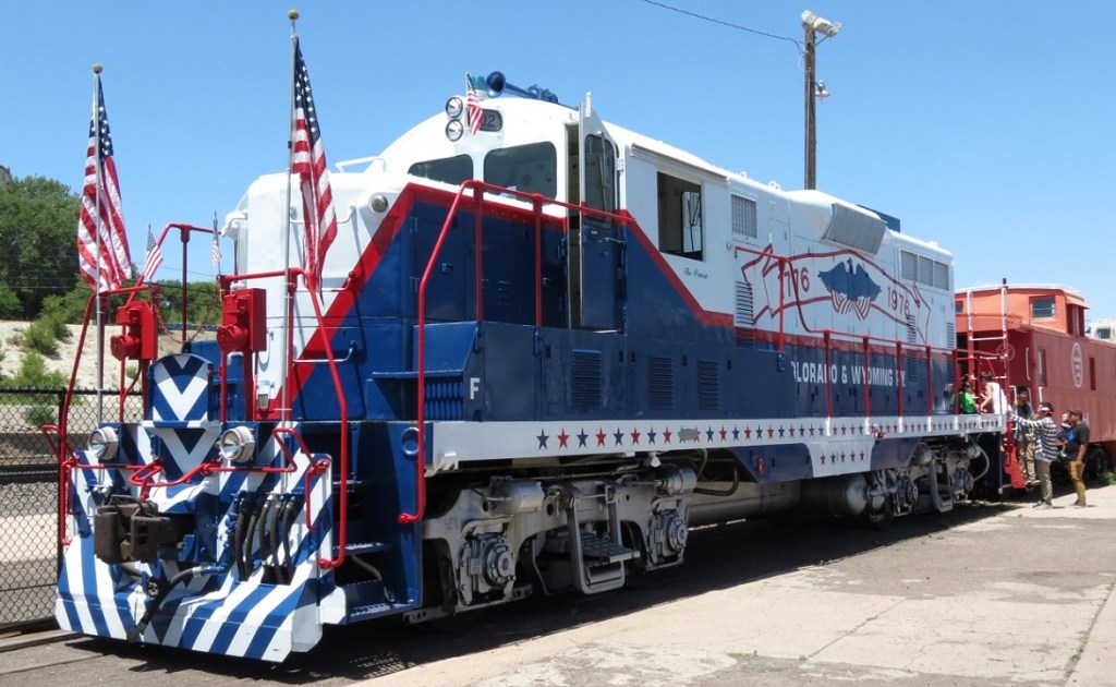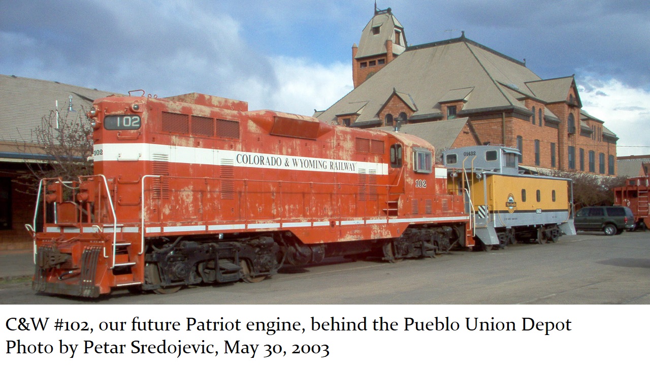 The red, white and blue Patriot engine is the Pueblo Railway Foundation’s finest example of its collection of Colorado & Wyoming (C&W) railway equipment. The Pueblo Railway Museum is proud to feature its collection of operational C&W locomotives as the Museum’s “motive power”. The Patriot, #102, is one of three Model GP7 locomotives owned and operated by the Museum. For more information on this website about our other two GP7 engines, #103 and #104, click here.