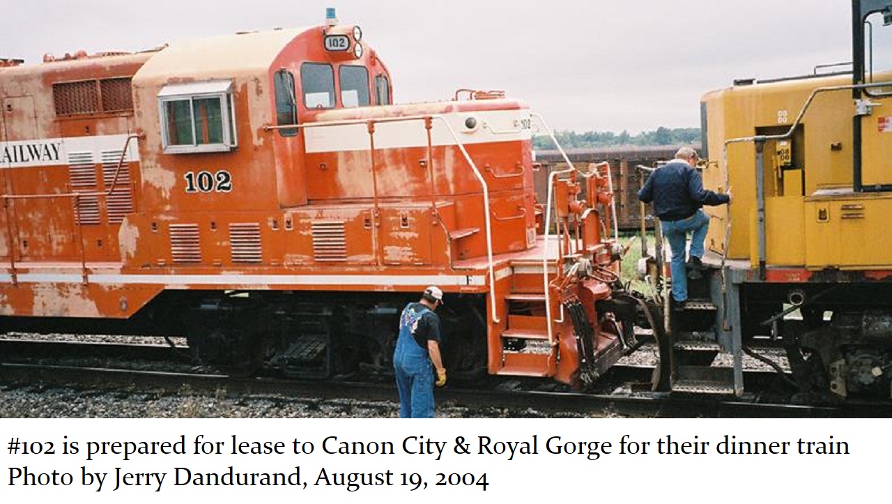 Following the sale of engine #101, engine #102 continued to work in Southern Colorado during the 80s and 90s. This engine, along with its “cousins”, #103 and #104, were all purchased by the Pueblo Railway Foundation from the C&W railroad on September 26, 2003, just a few months after the PRF was founded. At the time the PRF made this purchase, it was not possible to get the engines to the Museum’s D Street Shop – those tracks did not even exist yet. So to make use of engine #102 in the short term, it was leased briefly in 2004 to the Canon City & Royal Gorge Railroad to help pull their dinner train.
